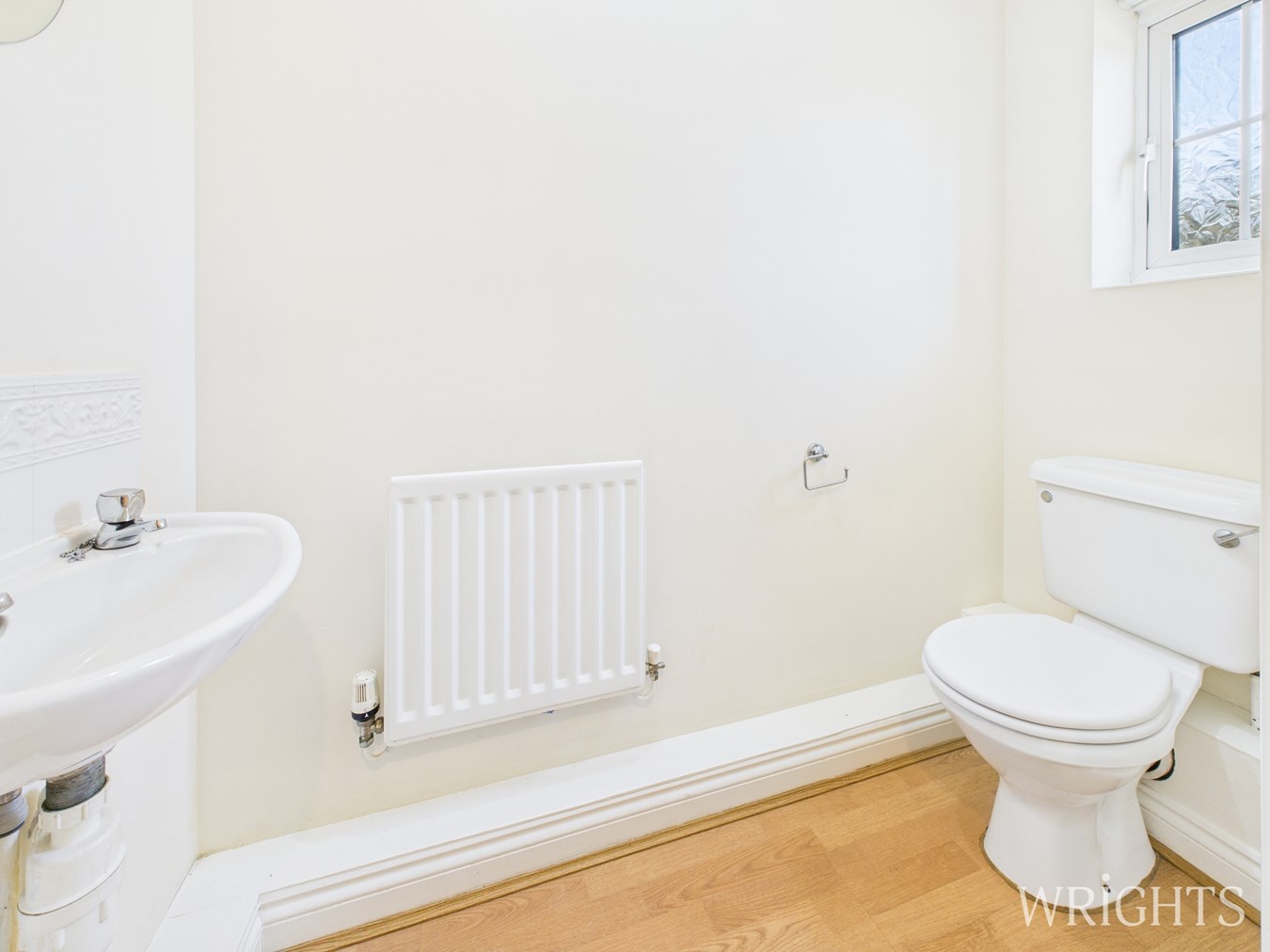 Low level W/C, hand wash basin, fitted radiator and laminate flooring. UPVC window to front aspect.