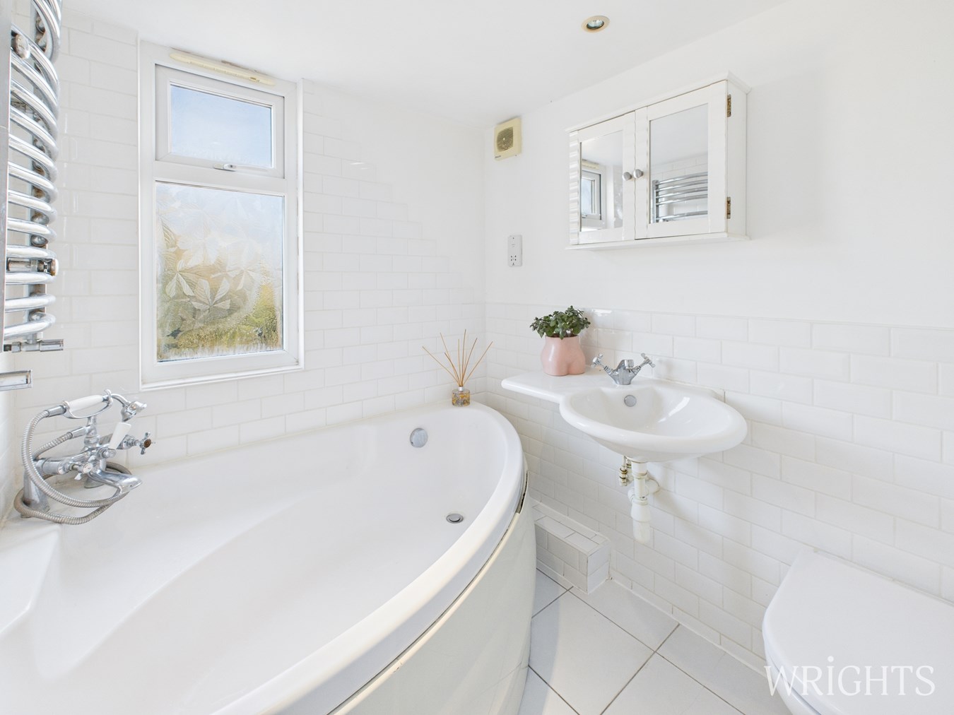 1.68m x 1.83m (5' 6" x 6' 0") Partially tiled with corner bath, hand wash basin, W/C and frosted window to the rear aspect.