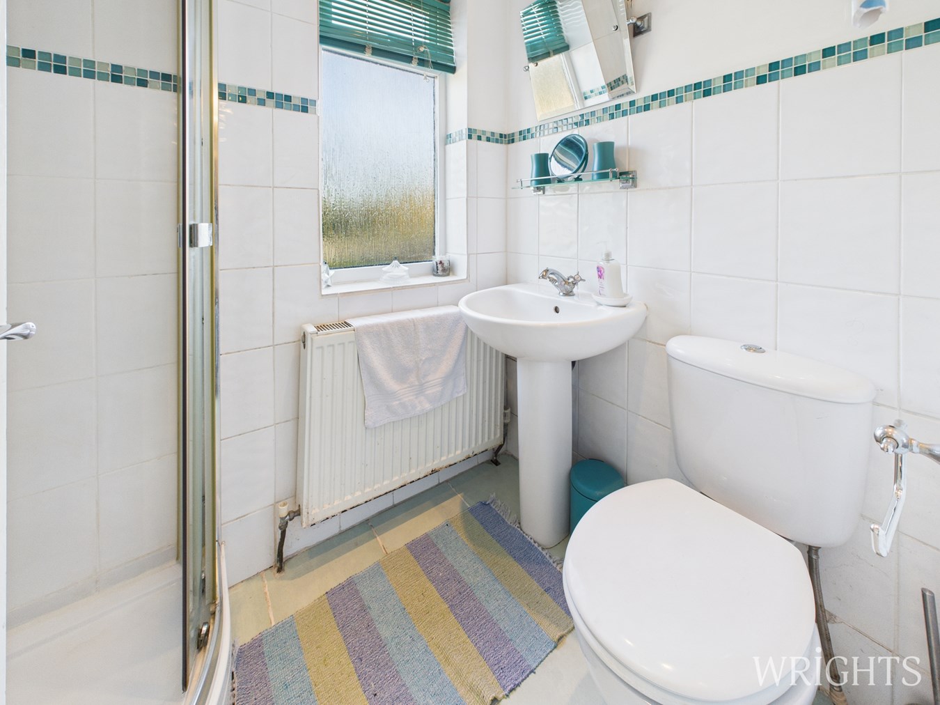 1.37m x 1.94m (4' 6" x 6' 4") Tiled throughout with corner shower cubicle, pedestal hand wash basin, W/C, radiator and frosted double glazed window to the rear aspect.