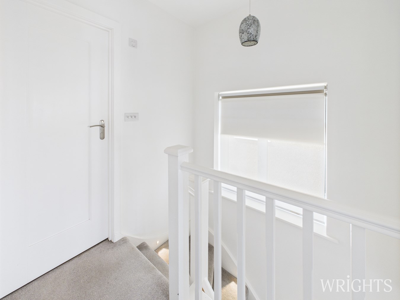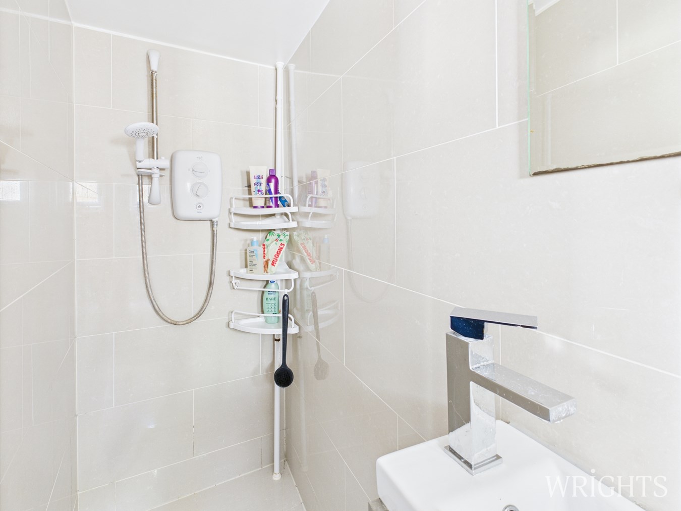 Rear aspect double glazed frosted glass window. Walk in shower cubicle, low level WC, wash hand basin, fully tiled walls and flooring, heated towel rail.