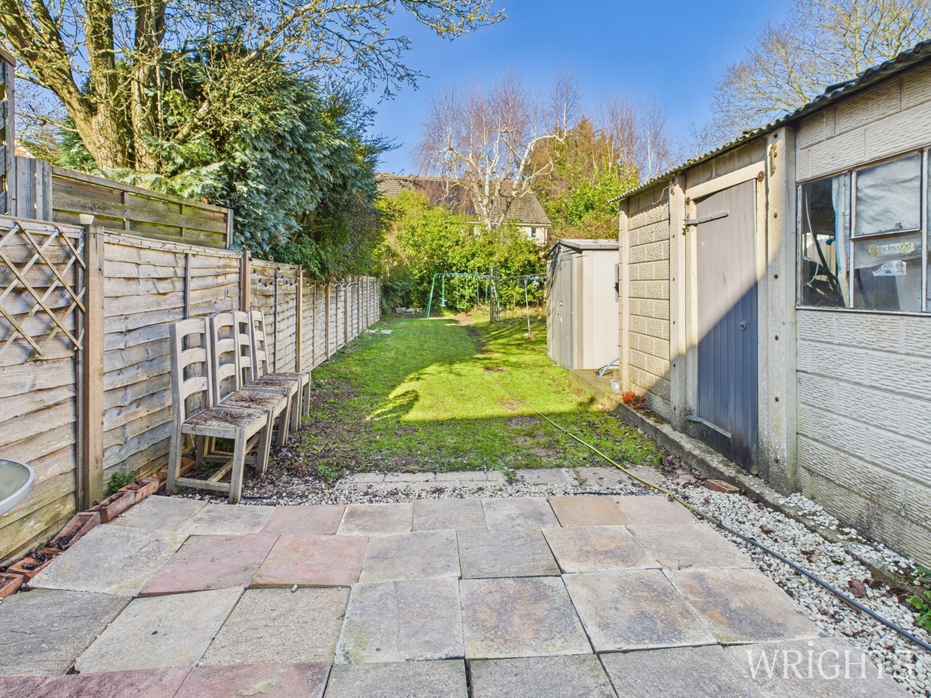 A large patio area adjacent to the property, mainly laid to lawn with fenced boundaries. Space for a shed that currently has electrics and water supplied to it.