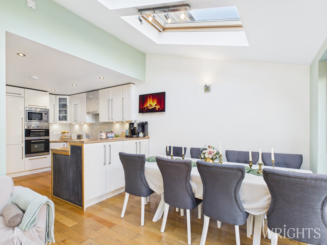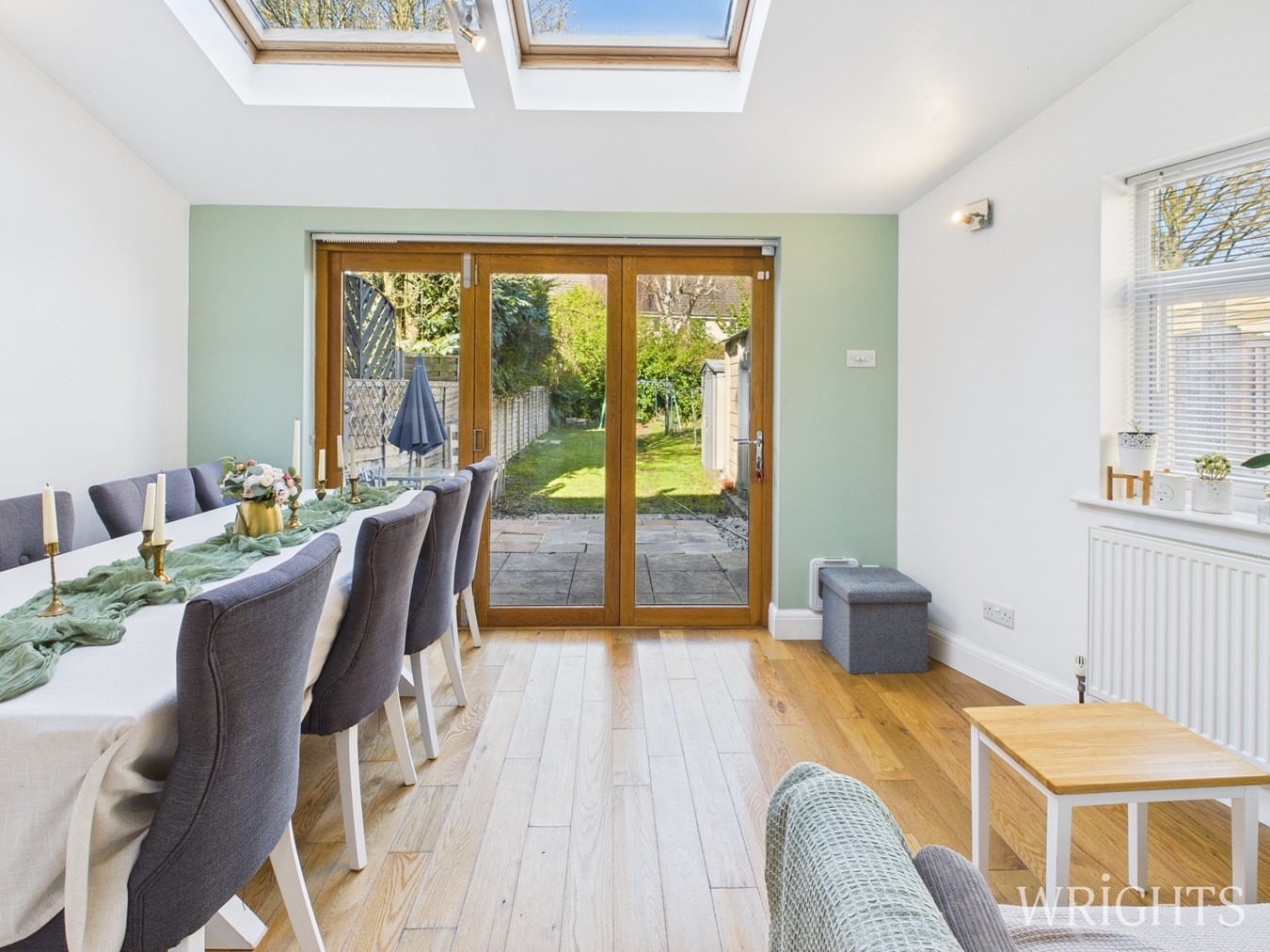 2.98m x 4.45m (9' 9" x 14' 7") (to max dimensions) Located in the extended part of the property. Ample space for a large dining table with additional seating area. Bi-Fold doors leading to the garden with double glazed window to the side aspect and two Velux windows in the roof.