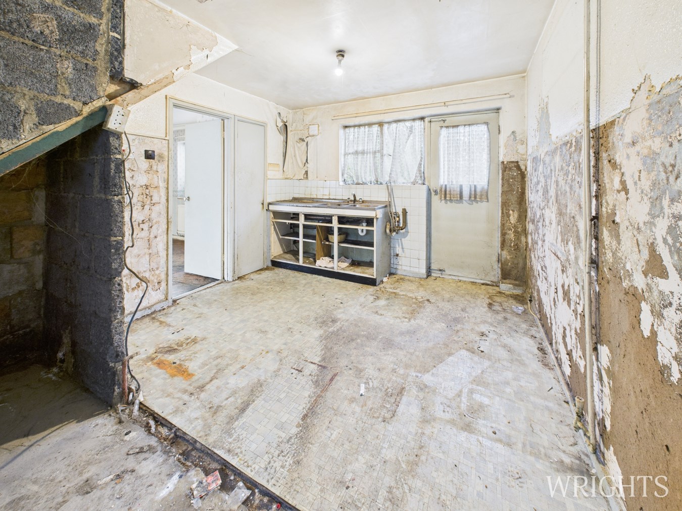 3.15m x 5.22m (10' 4" x 17' 2") Rear aspect single glazed window and door leading to rear garden. Door to front., Stainless steel sink unit with base below. Gas meter.