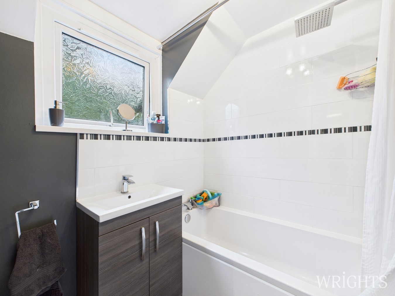 1.66m x 2.29m (5' 5" x 7' 6") Rear aspect double glazed frosted glass window. Modern three piece bathroom suite comprising panel enclosed bath with independent shower unit over with Rainfall shower head, wash hand basin with vanity unit below, low flush WC, complementary tiling to splashbacks.