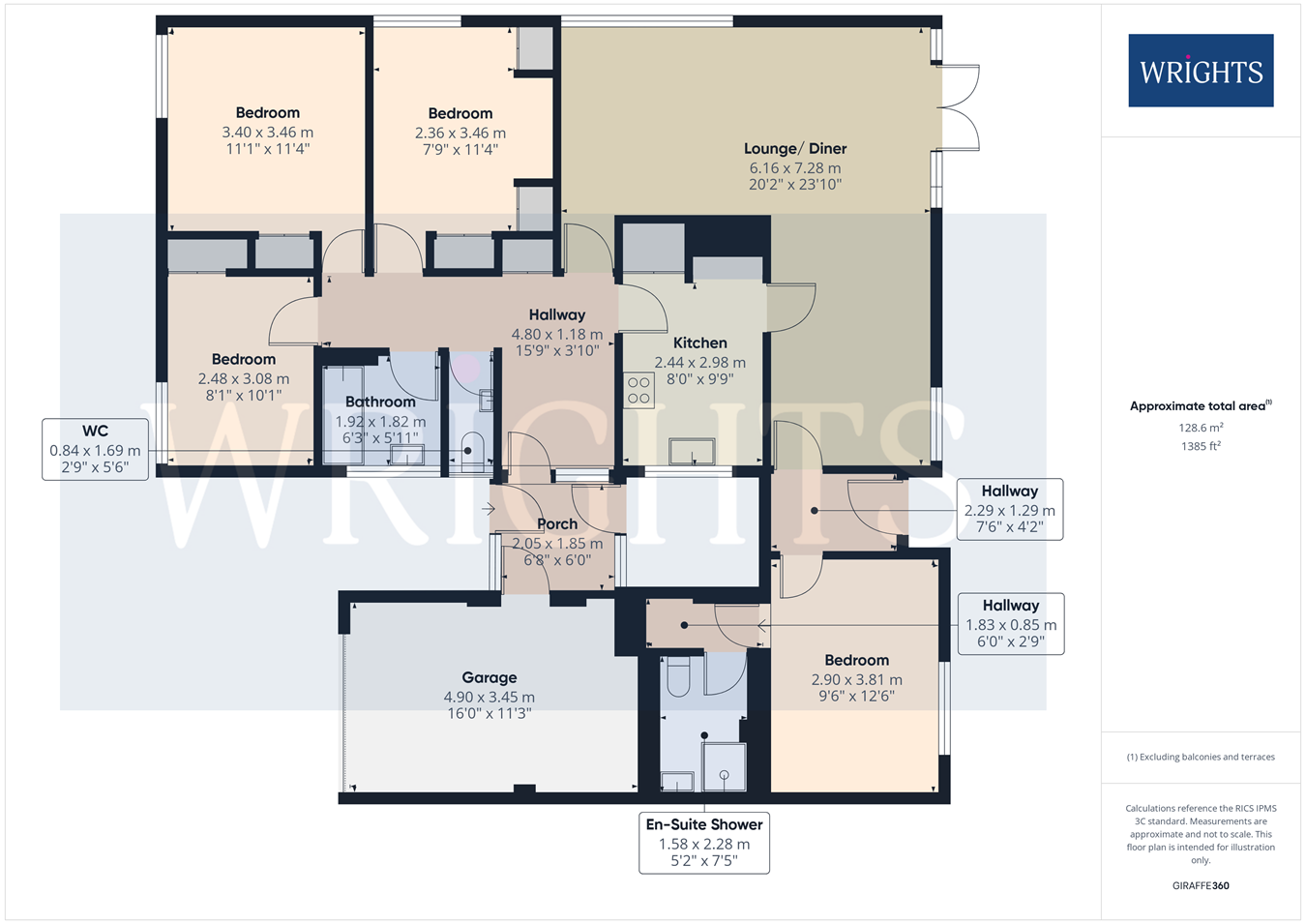 1.58m x 2.28m (5' 2" x 7' 6") Partially tiled with a corner shower cubicle, vanity hand wash basin and low level W/C.