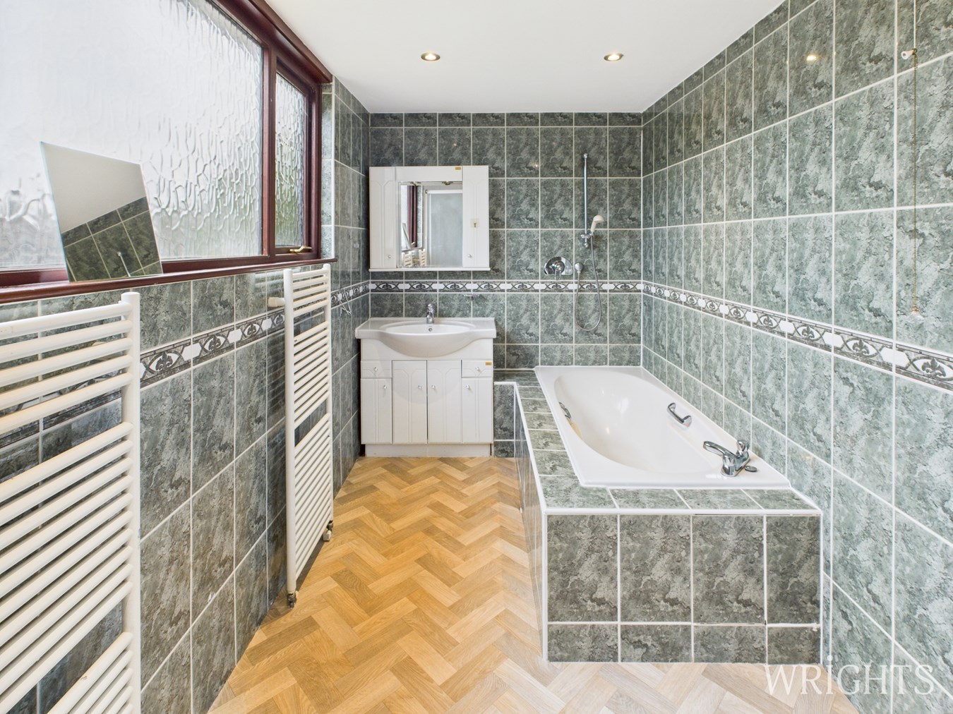 1.94m x 4.12m (6' 4" x 13' 6") Rear aspect double glazed frosted glass window. Four piece bathroom suite comprising of, enclosed bath, low flush WC, wash hand basin with vanity unit below. Heated towel rail and fully tiled walls.