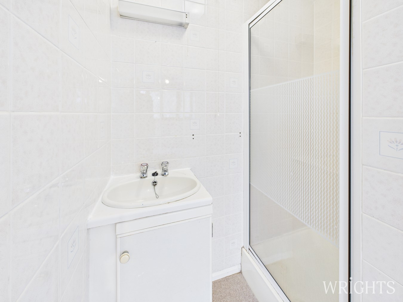 2' 5" x 5' 6" (0.74m x 1.68m) Fully tiled enclosed shower cubicle, wash hand basin with vanity unit below.