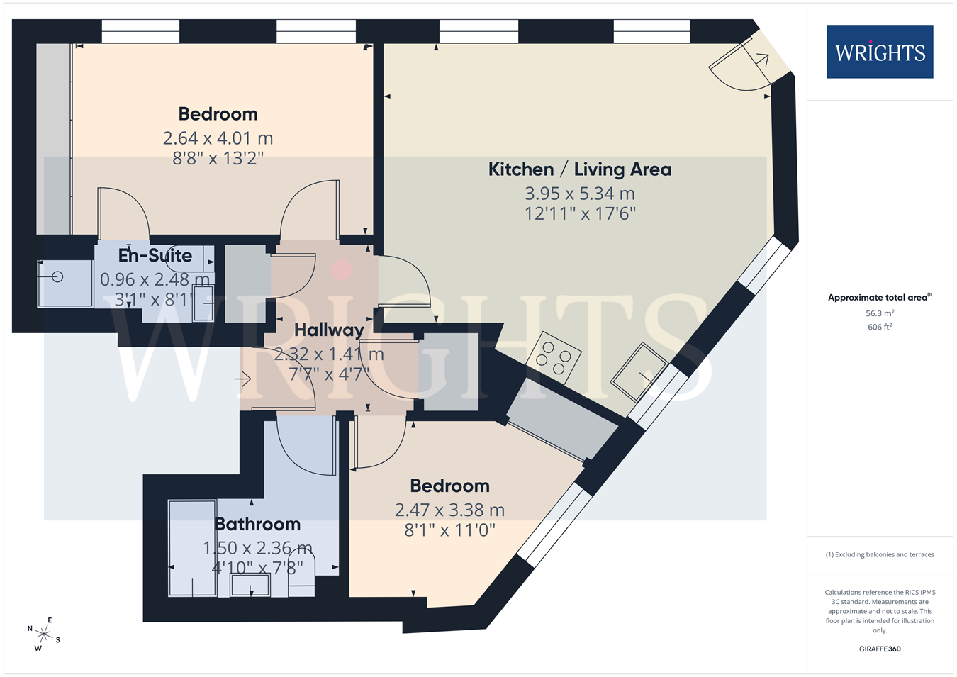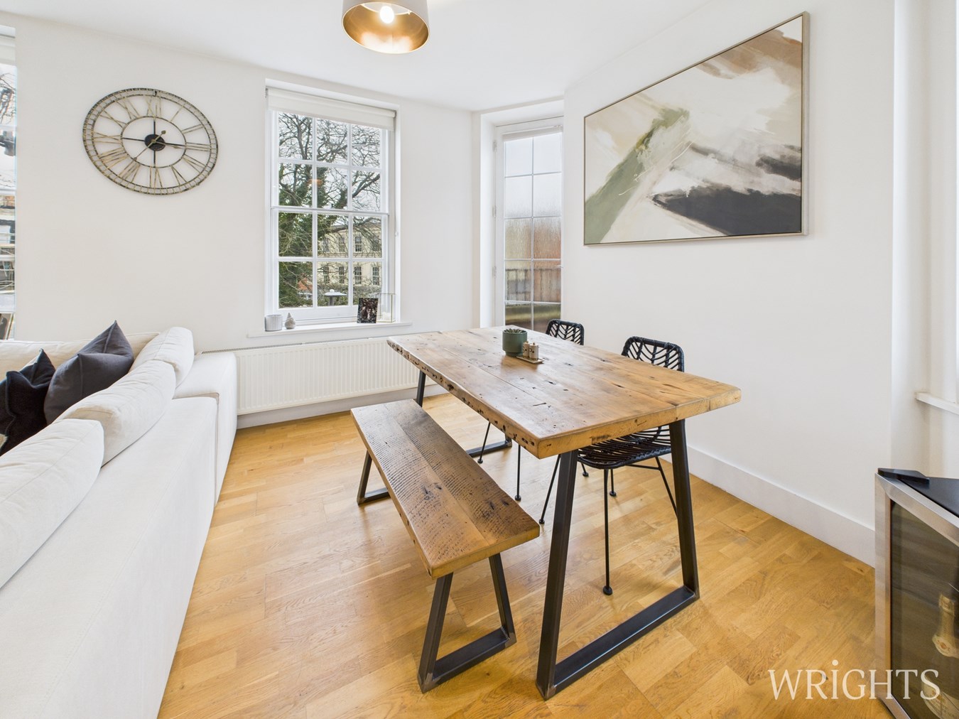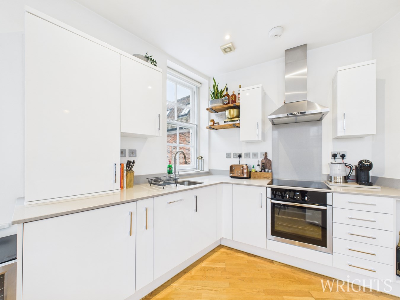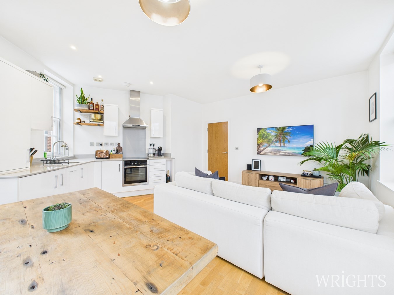 3.95m x 5.34m (13' 0" x 17' 6") Dual aspect secondary glazed feature sash windows, fitted radiator, wood flooring, door to private balcony overlooking new shopping parade. Kitchen area consists of a range of matching wall and base units with work tops over incorporating stainless steel sink unit. Fitted oven and hob with extractor fan over, spotlights.