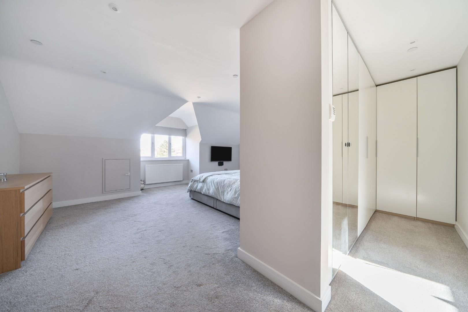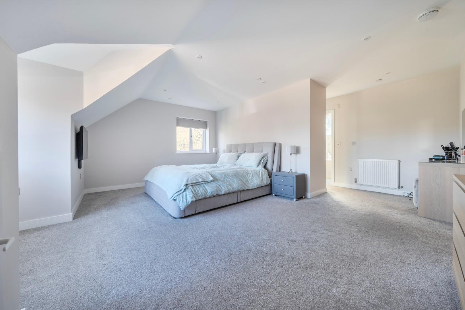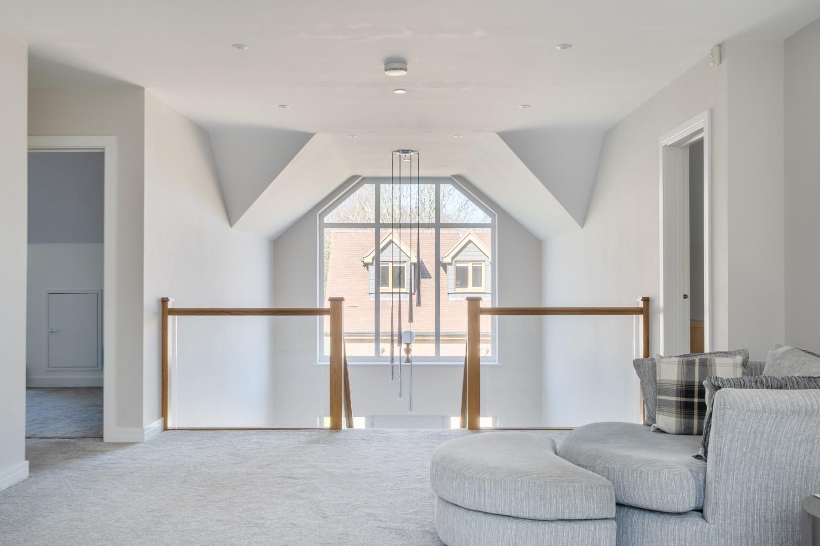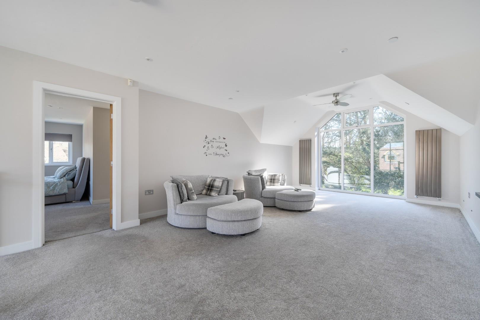 Venturing upstairs, you will find a generously sized master bedroom complete with a built-in dressing area and a luxurious four-piece en-suite bathroom featuring a double vanity unit. The landing leads to a secondary lounge area, which is flooded with light from dual aspect windows overlooking the front and back gardens. Bedroom two is another spacious double with access to the four-piece en-suite/family bathroom, while bedroom three also benefits from fitted wardrobes.