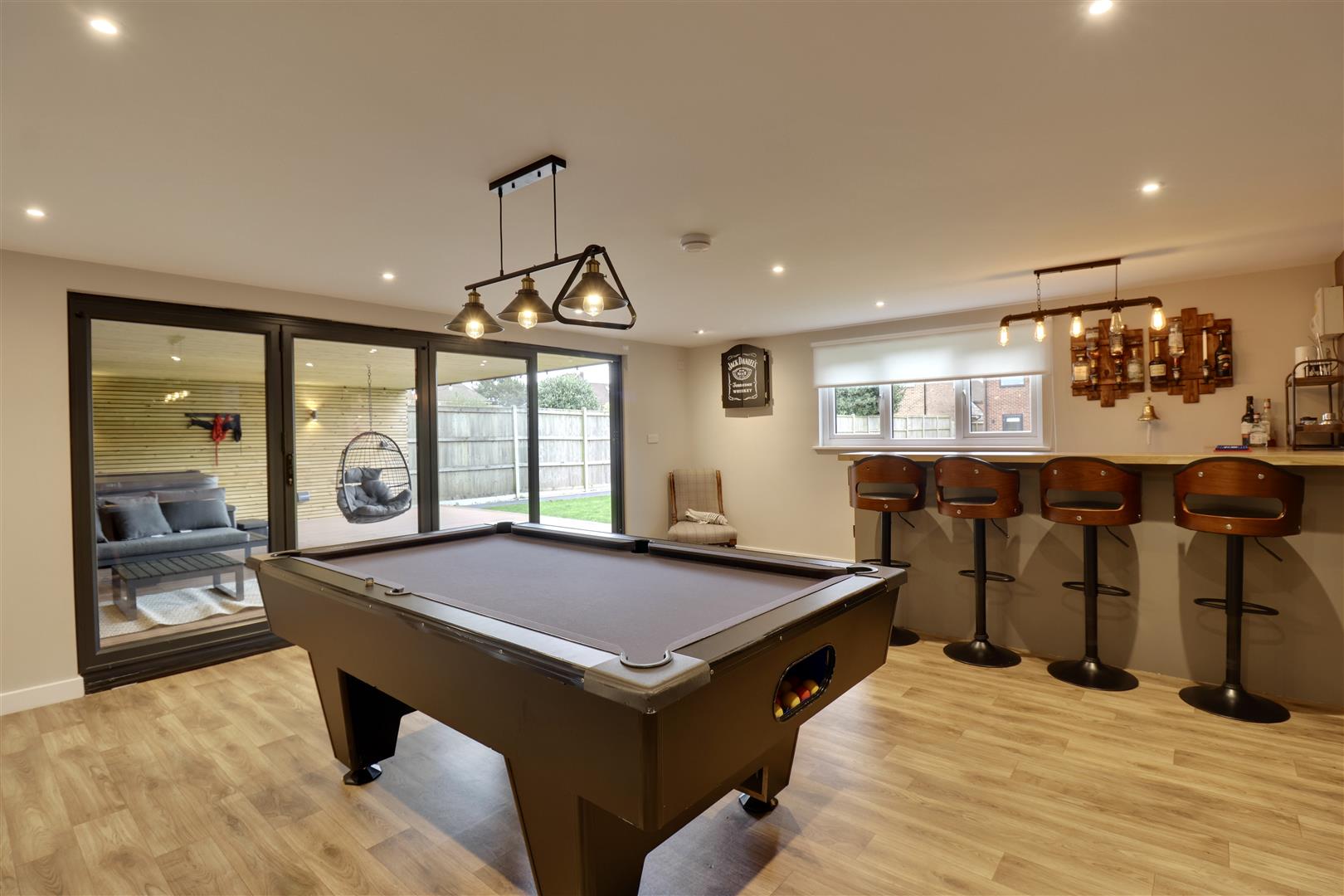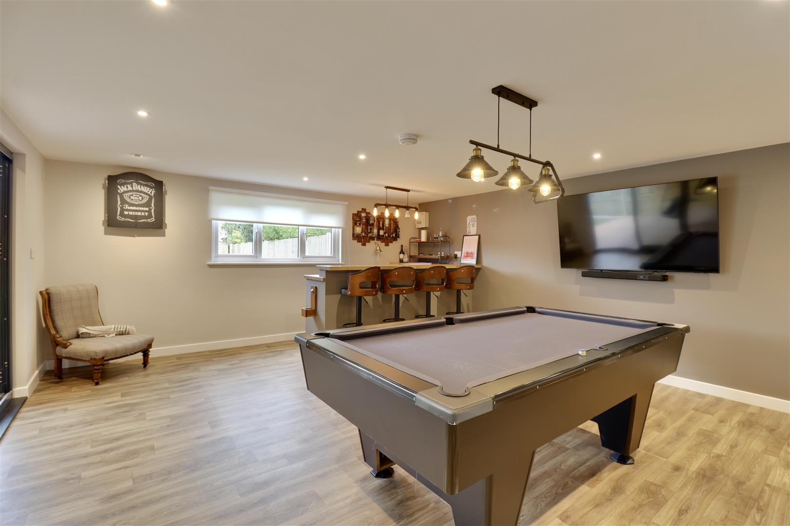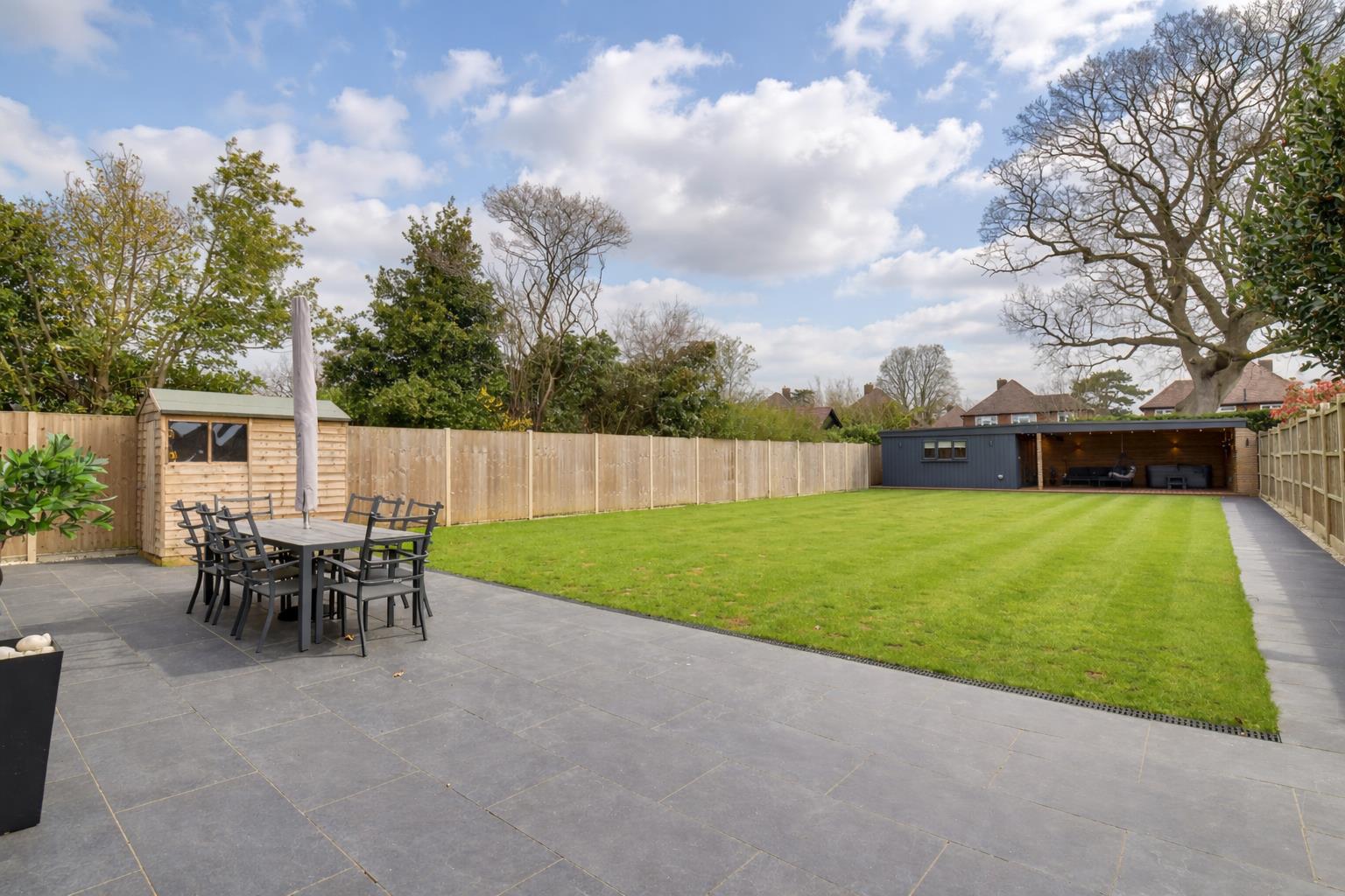 Externally, the generous rear garden has been landscaped to create distinct areas for relaxation and entertaining, including a summer house currently arranged as a bar-perfect for hosting during the warmer months. To the front, there is ample off-road parking, and the inclusion of an electric vehicle charging point adds a practical, forward-thinking touch.