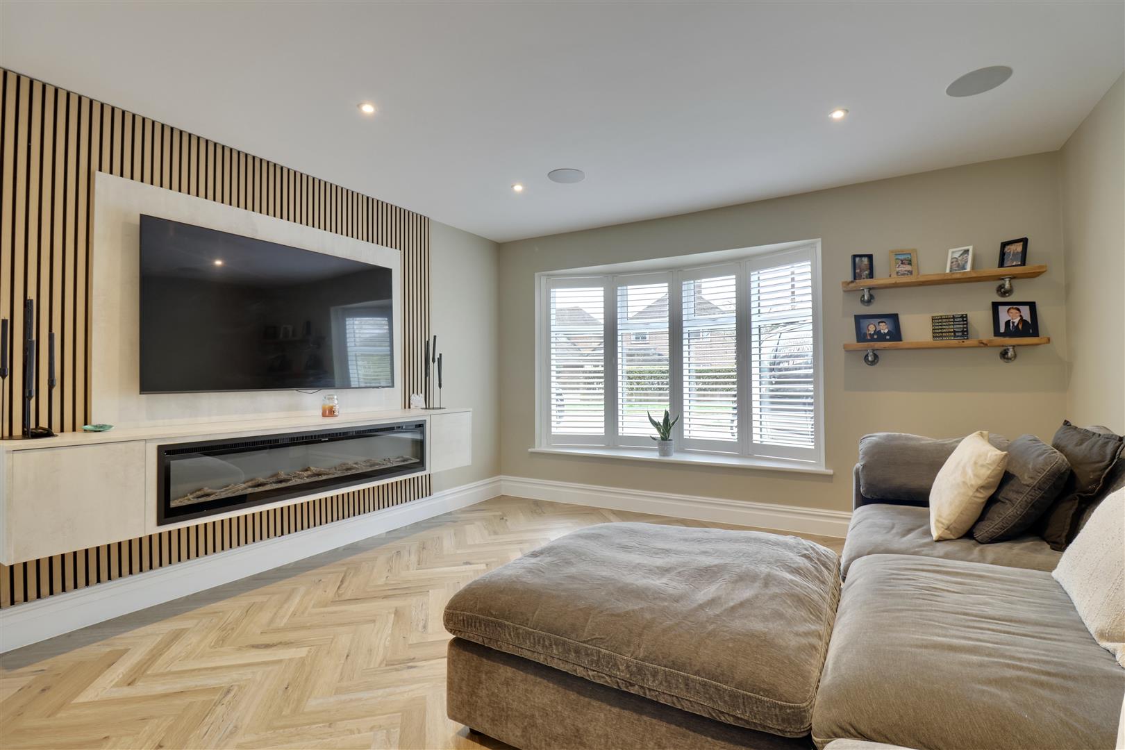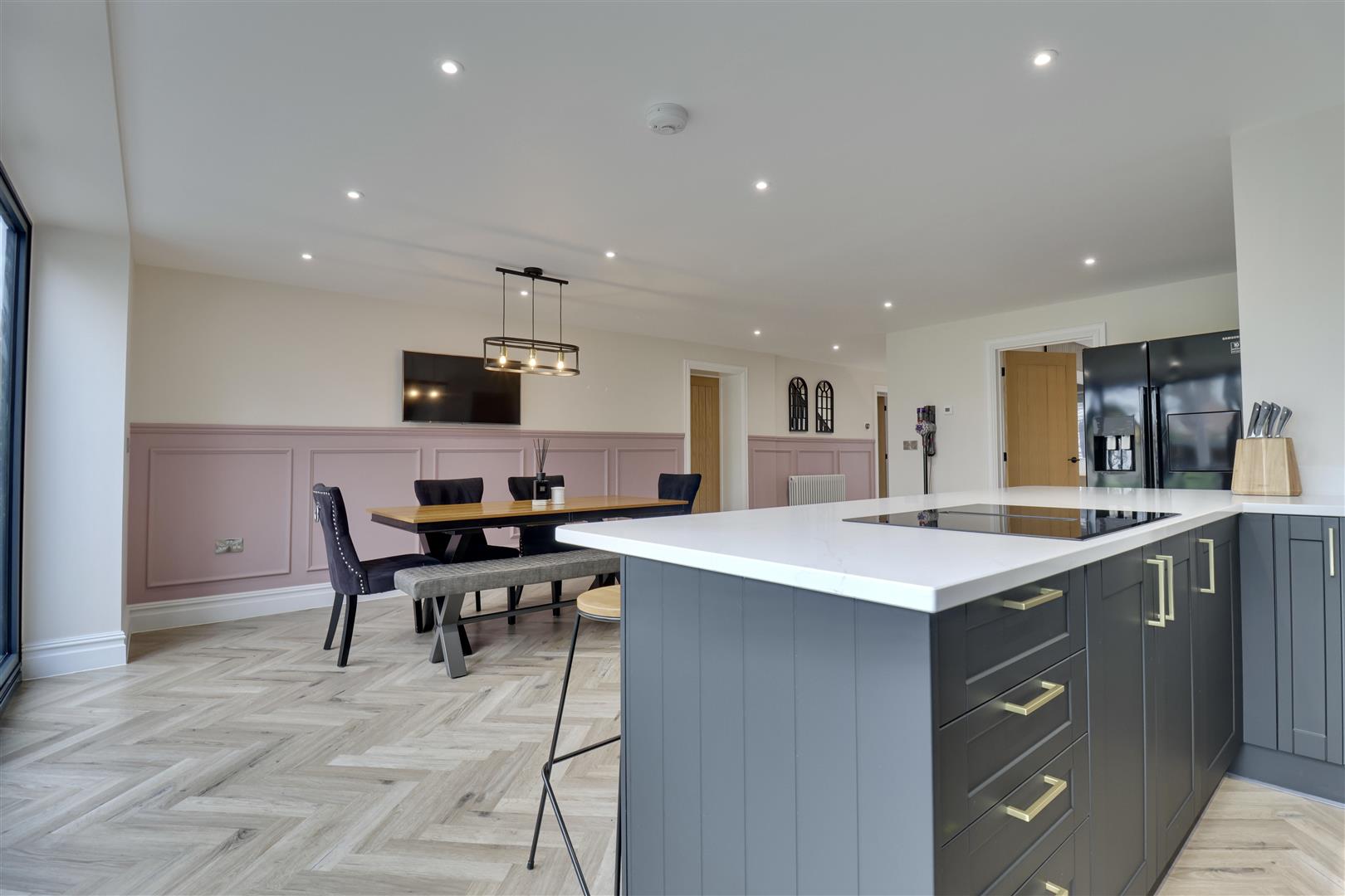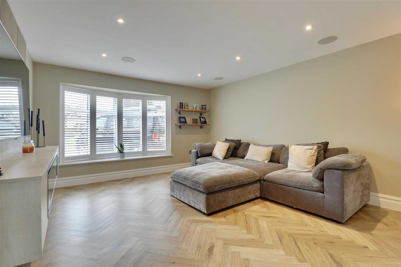 Externally, the generous rear garden has been landscaped to create distinct areas for relaxation and entertaining, including a summer house currently arranged as a bar-perfect for hosting during the warmer months. To the front, there is ample off-road parking, and the inclusion of an electric vehicle charging point adds a practical, forward-thinking touch.