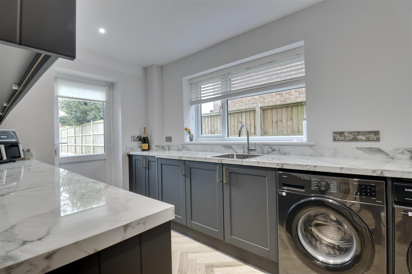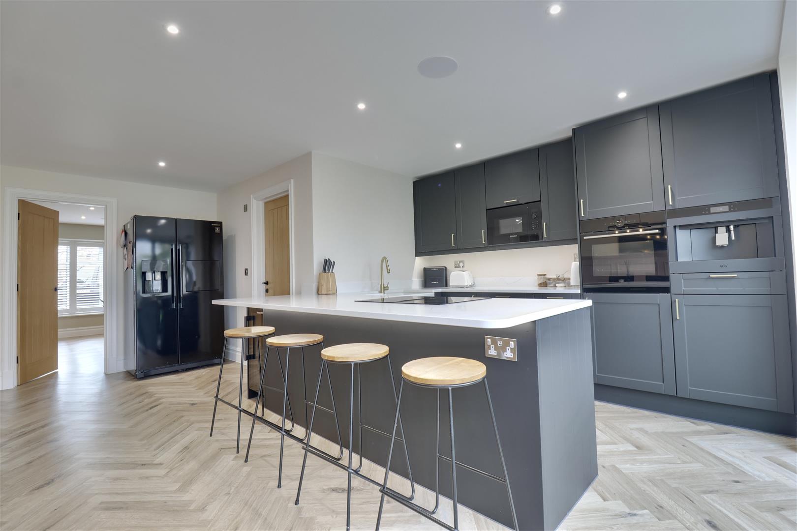 Internally, the home has been arranged to suit both family living and entertaining. A welcoming entrance hall leads through to multiple reception spaces, including a sung sitting room at the front of the home and an additional family room that could equally serve as a home office or additional bedroom. The kitchen has been designed as a sociable hub of the house, with ample worktop space and an island, fitted units and room for dining, with bi-fold doors to the garden.