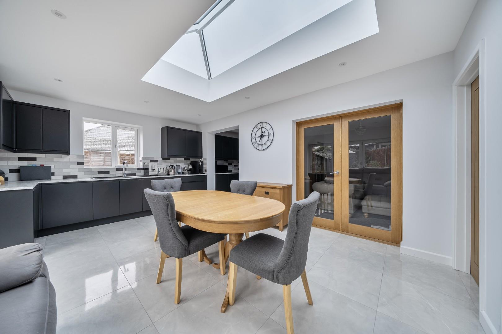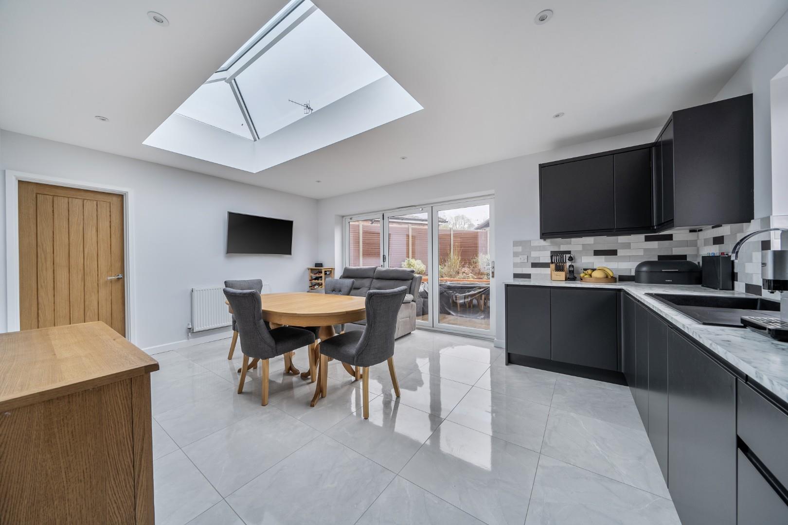 The heart of the home is undoubtedly the expansive lounge, measuring over 20 feet in length, which seamlessly flows into the stylish kitchen/diner. This area is enhanced by a beautiful skylight and bi-fold doors that open up to the garden, creating a bright and airy atmosphere. The kitchen is thoughtfully designed, with ample space for dining and easy access to the utility room and W.C. At the end of the hallway, the third bedroom offers additional versatility.
