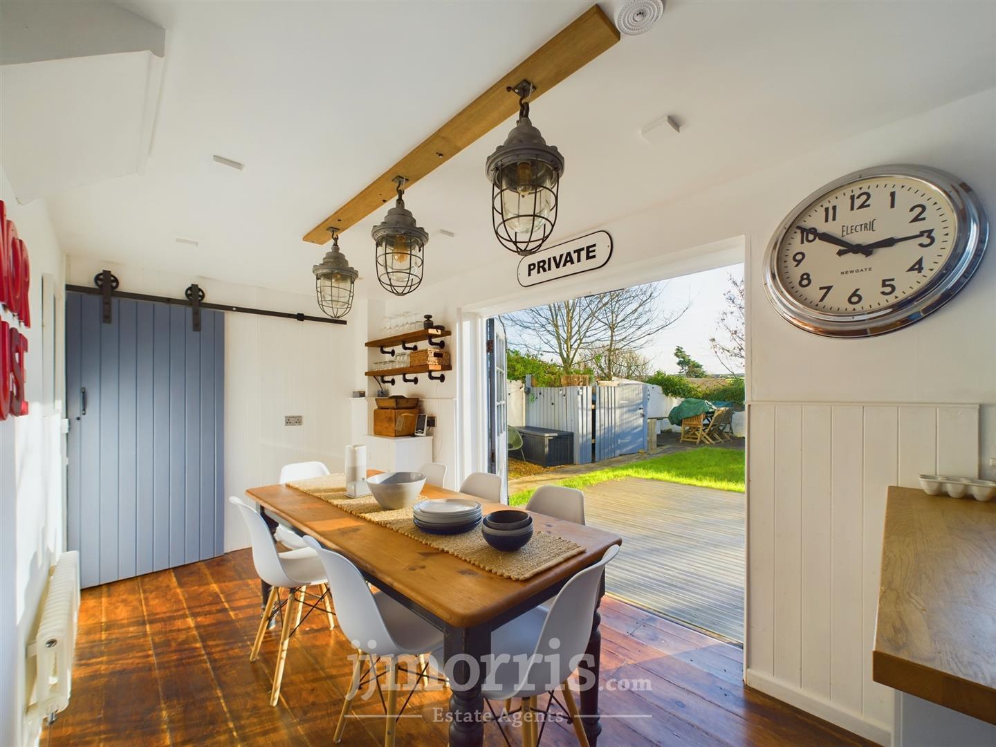 Kitchen/Breakfast Room - 6.63m x 2.44m (21'9" x 8'0" ) - (maximum). With an insulated Pine floor, 2 uPVC double glazed windows, range of fitted floor cupboards with Oak worktops, Belfast sink with mixer tap, ceiling light and 3 ceiling light over breakfast table, Cooker Box, 13 power points, wall shelves, built in Smeg Microwave, built in Smeg Convection Oven/Grill, built in Refrigerator, built in Freezer, Hotpoint 4 ring Induction Hob, part tile surround, 2 column radiators, built in Dishwasher, double 9 pane glazed French doors to a raised Timber Decked Patio and rear Garden and a sliding door to:-