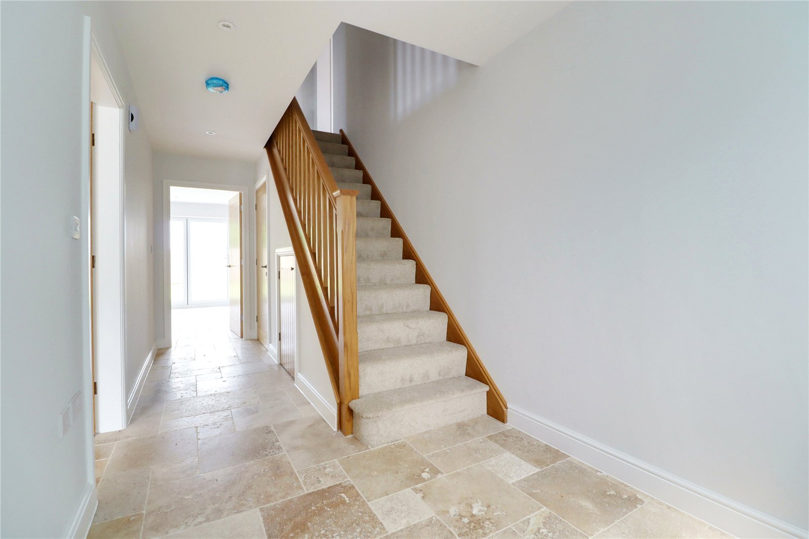 Central Reception Hallway 6'11" x 19'5" (2.1m x 5.92m). Front composite double glazed entrance door with patterned glazing, attractive stone tiled floor with underfloor heating, feature staircase with oak balustrading with newel post and handrail with understairs storage and inset ceiling spotlights.