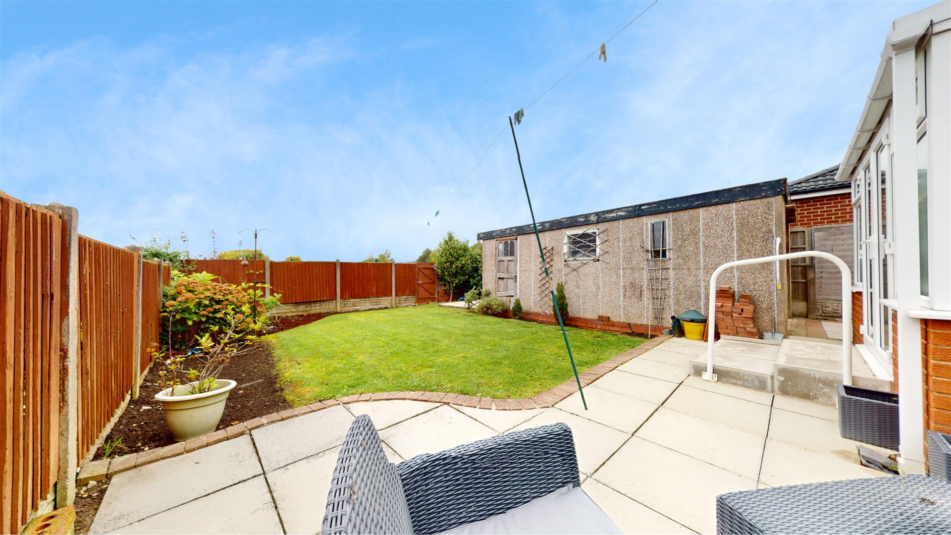 Externally, the property continues to impress. To the front and side, the home has been neatly flagged, offering excellent kerb appeal, ample off-road parking, and low-maintenance appeal. To the rear, the generous garden features a detached garage, lawned area, and a flagged seating space, perfect for relaxing or hosting family and friends during the warmer months.