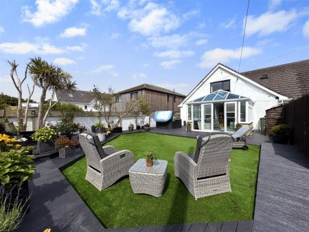 Outside - The garden has been thoughtfully designed with low maintenance in mind, featuring a combination of artificial lawn and a raised wooden decking area to the side, perfect for relaxing or entertaining. There's a dedicated space on the decking for a hot tub, offering a great spot to unwind. The garden is fully enclosed by a mix of fencing and walling, providing both privacy and security.