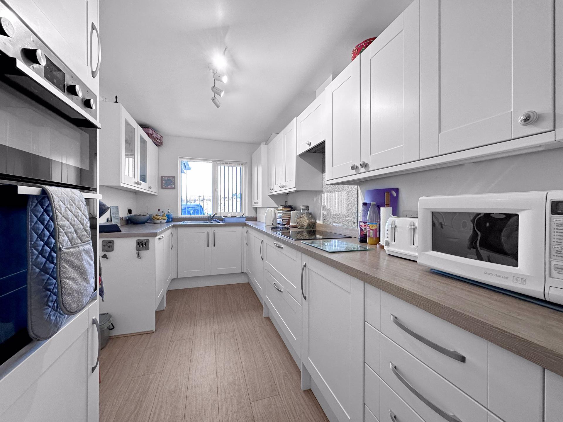 Lovely kitchen with a fitted modern kitchen having an extensive range of eye and base level units and ample worktop surfaces over. Stainless steel one and quarter sink unit and drainer with taps over, 4 ring ceramic electric hob with extractor fan over, eye level double oven and grill, integrated dishwasher and integrated fridge and freezer, ample power points, UPVC double glazed window to the front and further UPVC double glazed window to the side, cupboard housing the Worcester combi gas boiler, door to