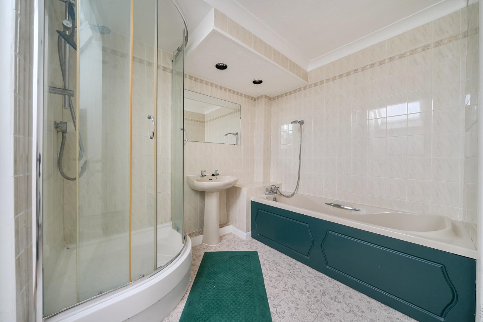 The first floor features a well-designed landing space that leads to four bedrooms. The master bedroom is particularly spacious and includes an en-suite bathroom for added privacy. Bedroom two is a good-sized double with fitted wardrobes, while bedroom three is another double room. Bedroom four is a single room, perfect for guests or as a study. The main bathroom on this level is a luxurious four-piece suite, complete with a walk-in shower, separate bath, basin, and toilet.