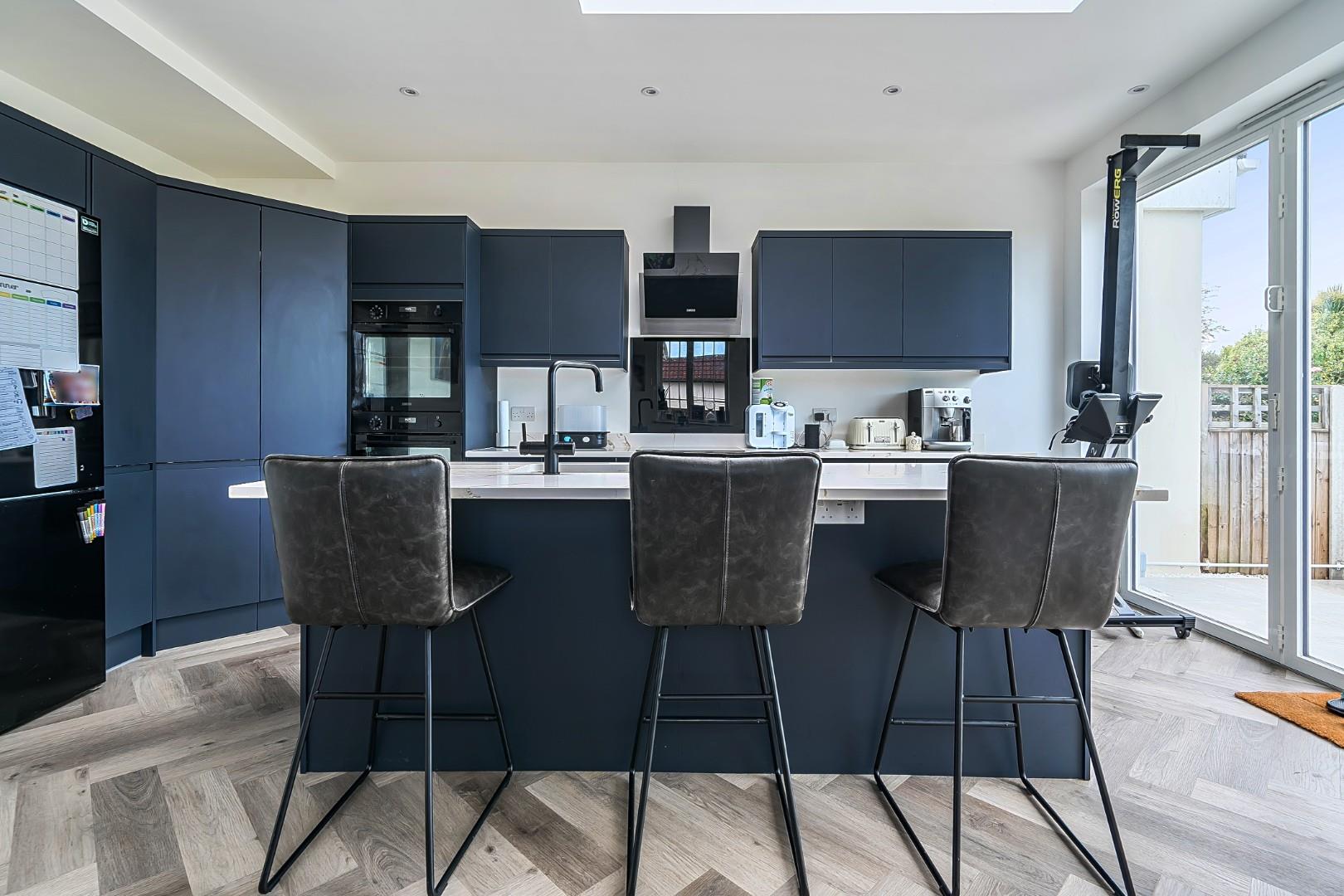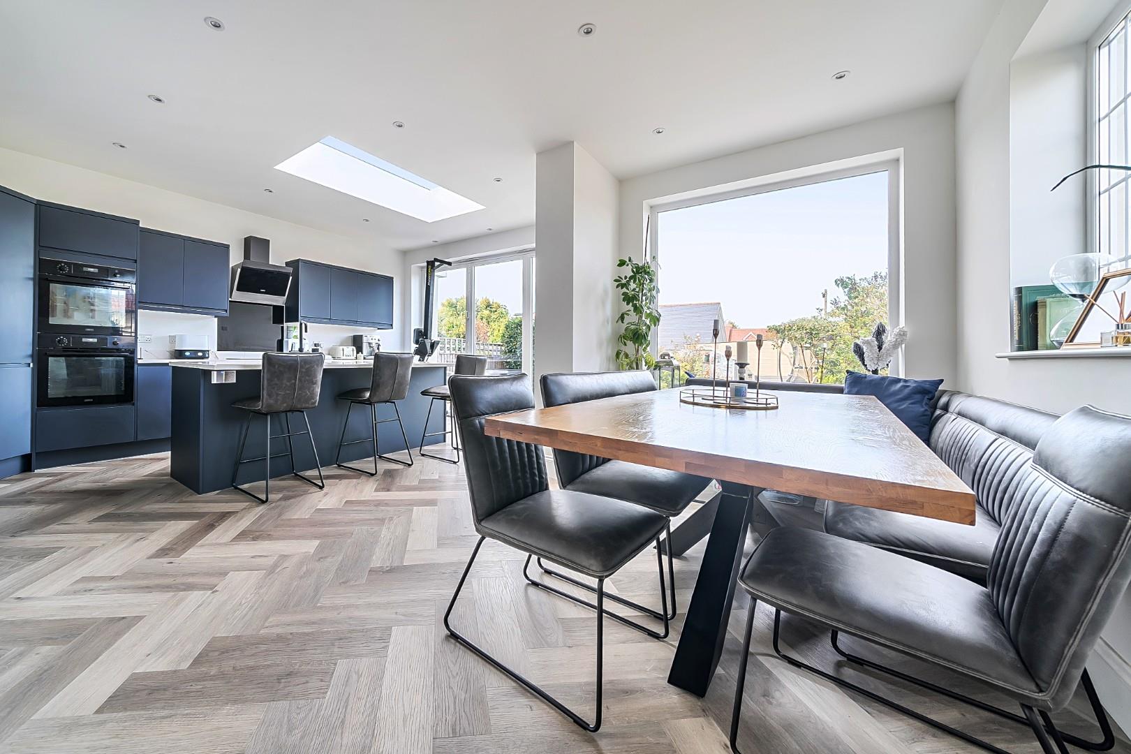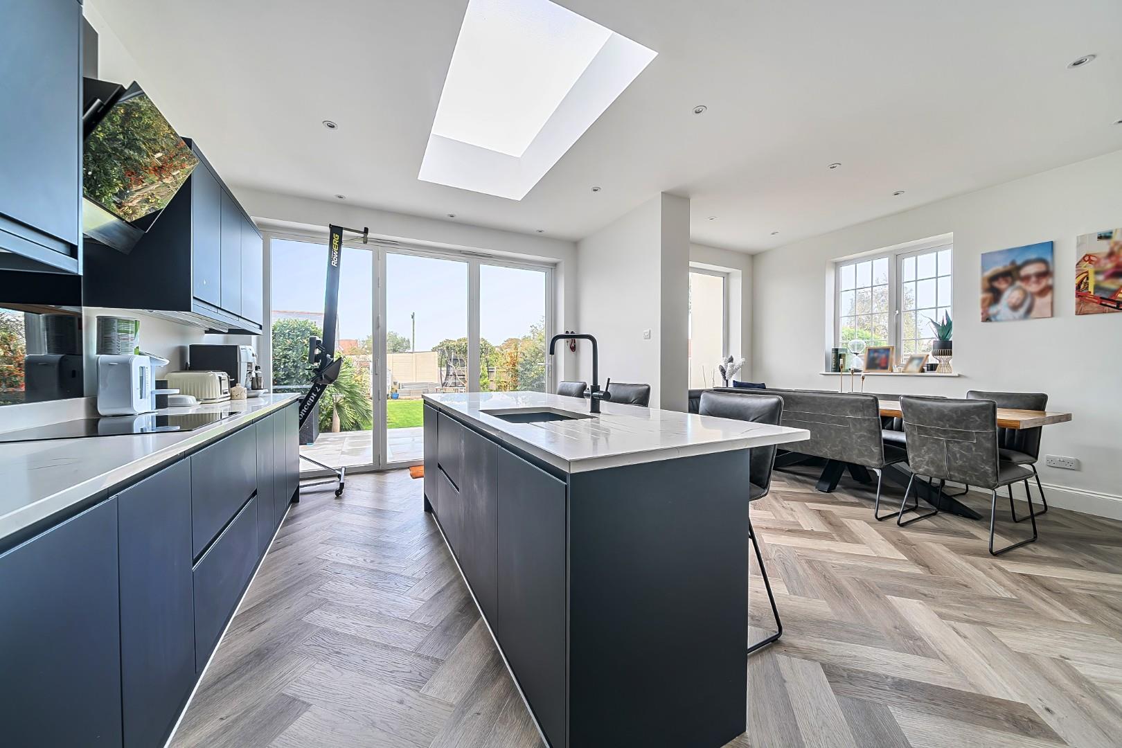 The rear extension is a standout feature, showcasing a generous picture window that frames a stunning aspect of the beautifully landscaped garden. The open-plan modern kitchen, complete with a stylish charcoal finish and a central island, is perfect for both cooking and entertaining, making it the heart of the home with the benefit of it's spacious secondary snug/living area.