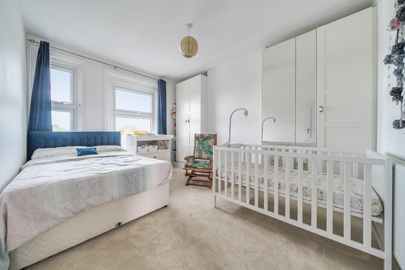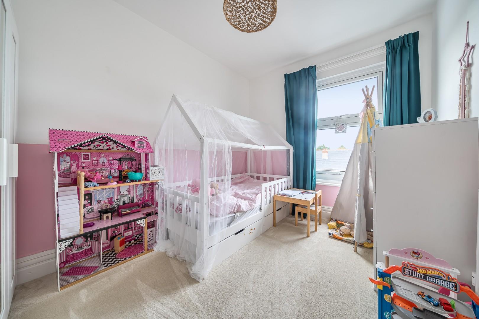 Upstairs, the three comfortable double bedrooms offer ample space for relaxation. The primary bedroom is particularly noteworthy, featuring built-in storage and a large bay window that floods the room with natural light.