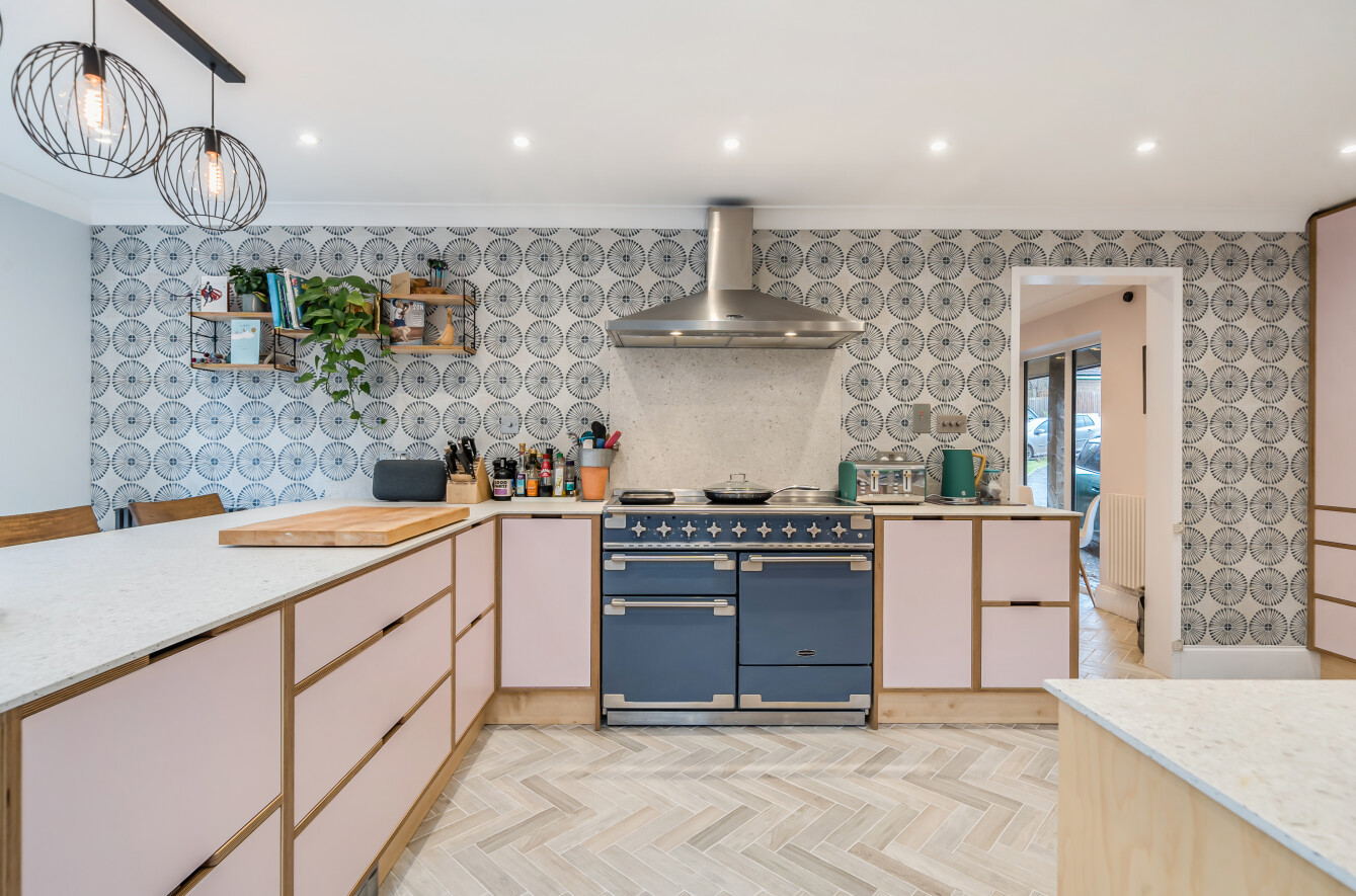 The kitchen has been opened up, extended and modernised to create a super open plan kitchen/dining room enjoying a triple aspect with the added benefit of patio doors to front and back and part vaulted ceiling with velux windows. The kitchen transformation has been a labour of love with bespoke hand made units, porcelain worktops and splashback, Rangemaster oven and hood, under plinth built in vacuum system, double butlers sink and integrated microwave and dishwasher.