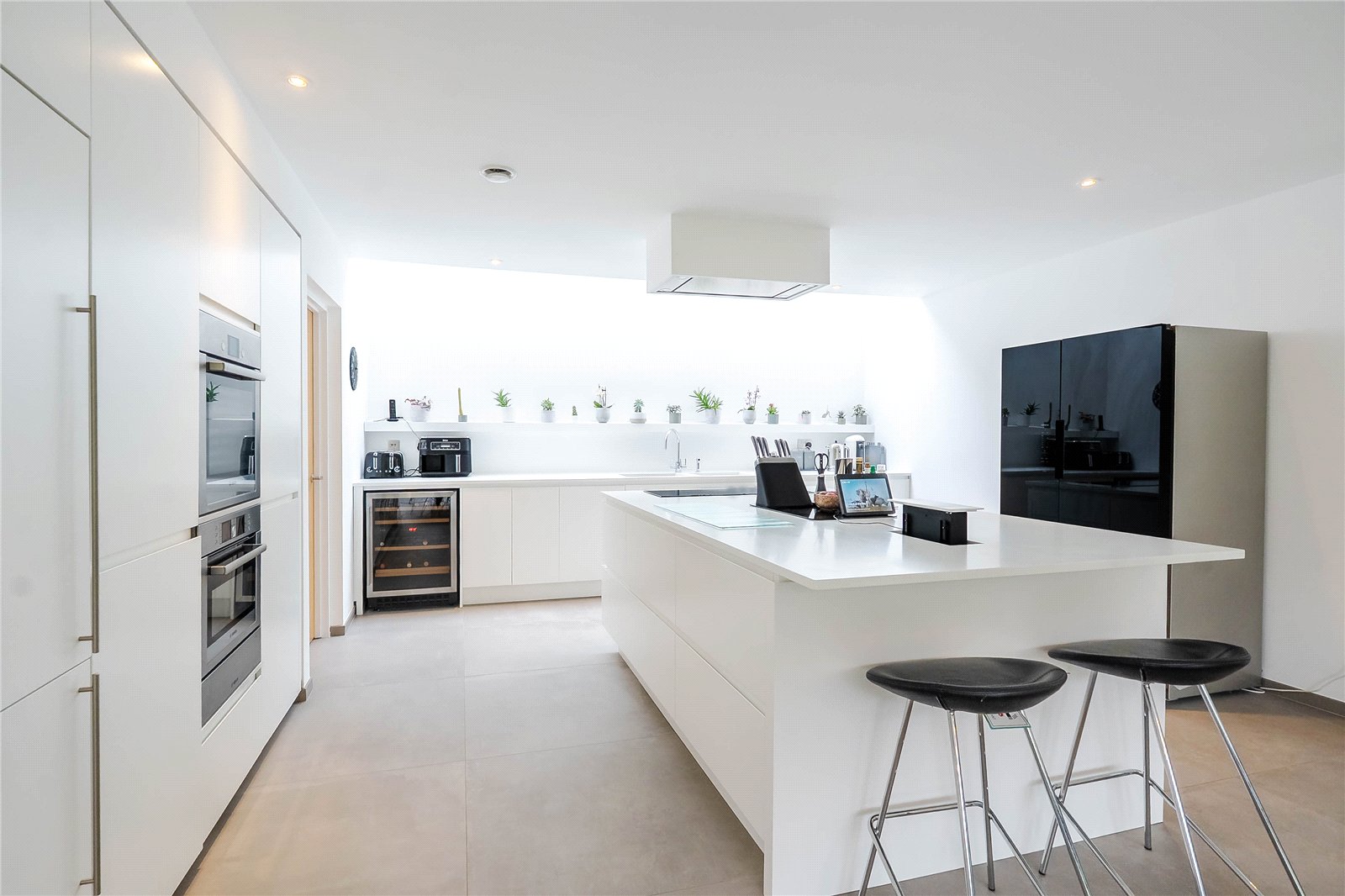 The ground floor is a masterclass in open-plan living, featuring a bright and airy design that seamlessly blends elegance with functionality. The kitchen, breakfast, and family room enjoy stunning easterly and southerly views, while sliding doors open onto a spacious decked terrace—perfect for entertaining. The bespoke Shaker-style kitchen is fully equipped with premium Bosch appliances, including an oven, combination oven/microwave, warming drawer, induction hob, separate drinks fridge, and dishwasher. A discreet sliding door leads to the dual-aspect sitting room, which opens onto the side and rear garden, offering a tranquil retreat.
