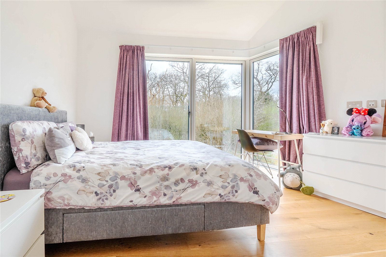 The first-floor galleried landing leads to four beautifully appointed double bedrooms. The master suite features oak flooring, a part-vaulted ceiling, and breathtaking woodland views. A walk-in wardrobe and luxurious refitted en suite bathroom with a walk-in shower and sink vanity complete this serene sanctuary. The guest bedroom enjoys its own refitted en suite, while the remaining two bedrooms share a stylish refitted Jack & Jill bathroom with a shower over the bath.