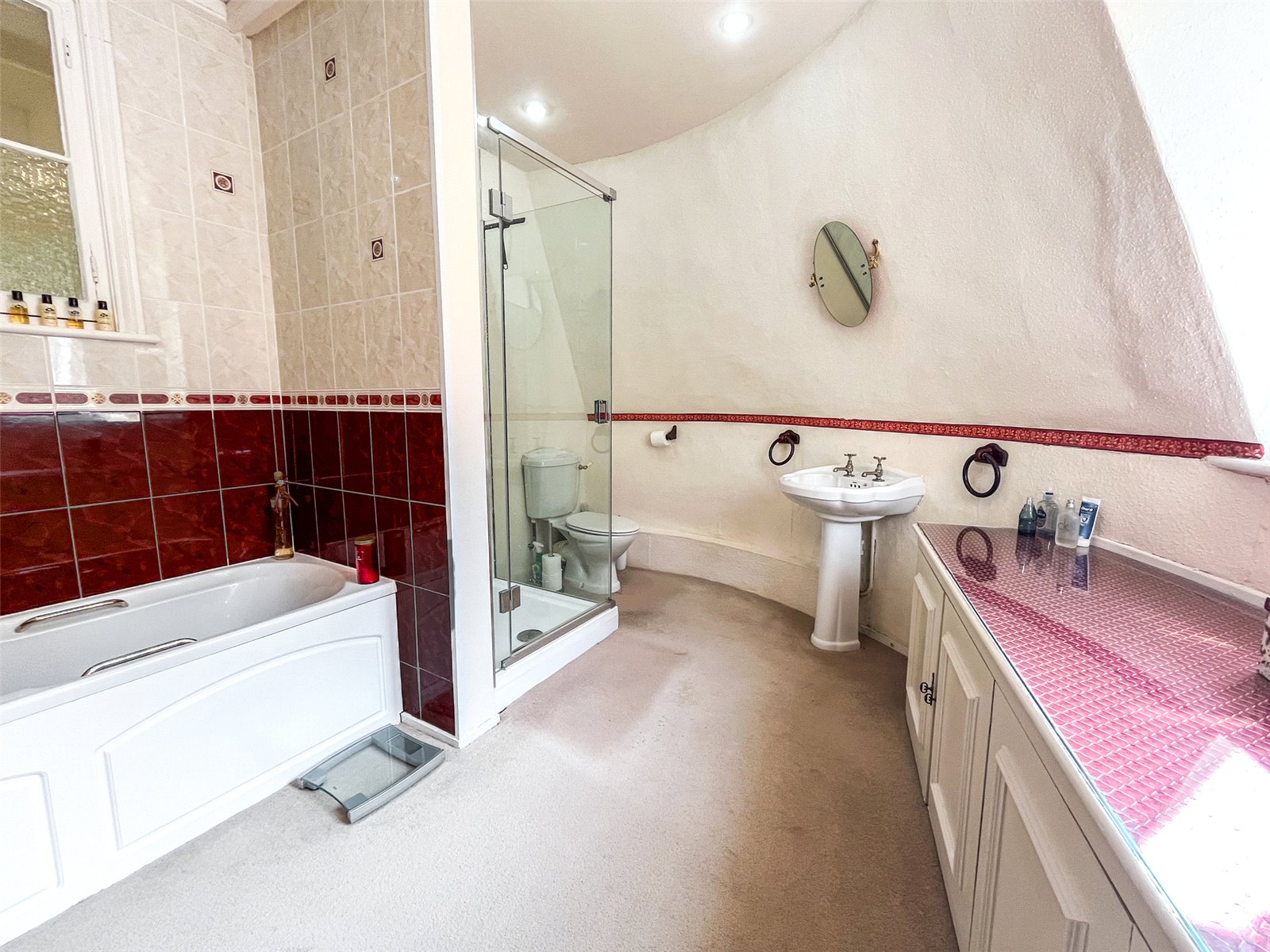 ENSUITE ROUNDEL BATHROOM / SHOWER ROOM (adjacent): Comprising of a large double size shower with heavy glazed front, pedestal wash basin, W.C., separate fitted panelled bath with mixer tap and tiled surrounds, fitted vanity base cupboards, radiator, window with aspect to outside.