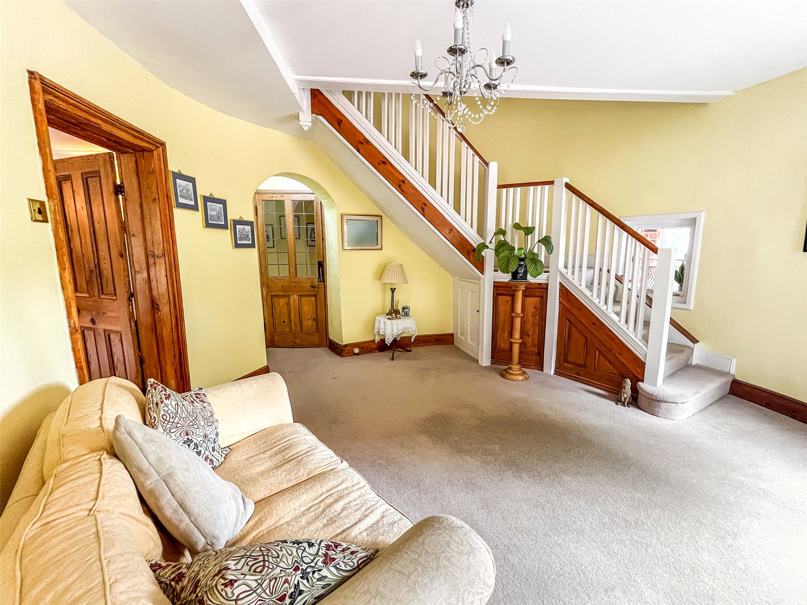 FEATURE ROUNDEL RECEPTION HALL: A most delightful and naturally bright circular room which is triple aspect with views over the property’s beautiful gardens, and which also has an elegant wooden staircase leading off from the far side to the first-floor accommodation. In addition, there is a feature ceiling light, a radiator and doors leading off to a sitting room and the inner hallway.