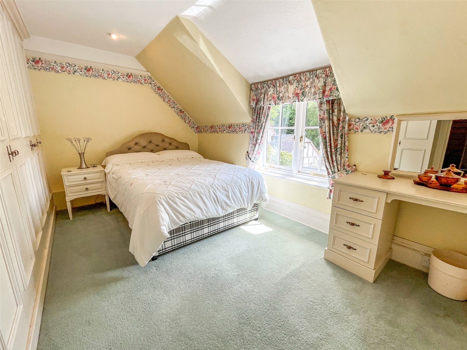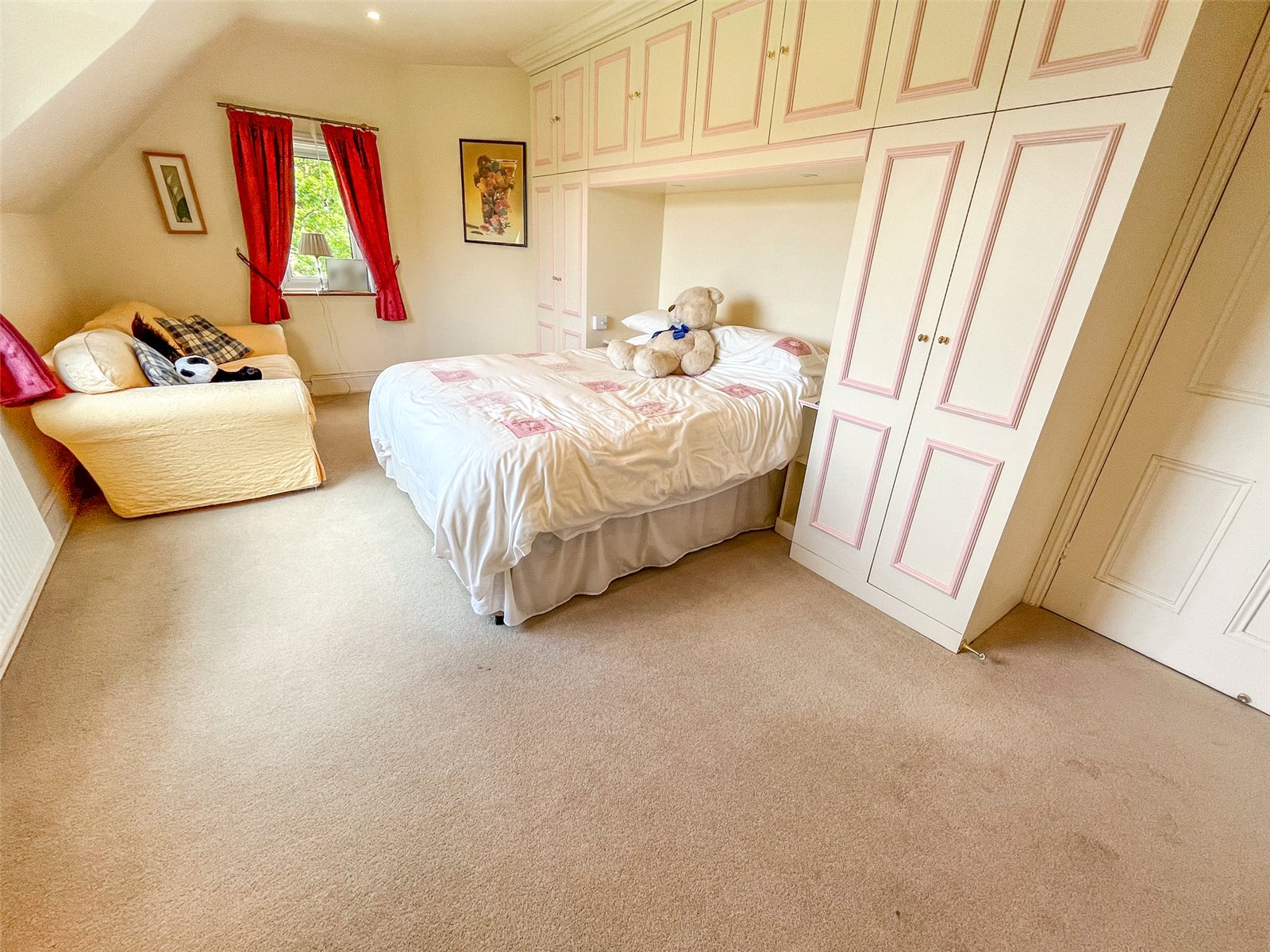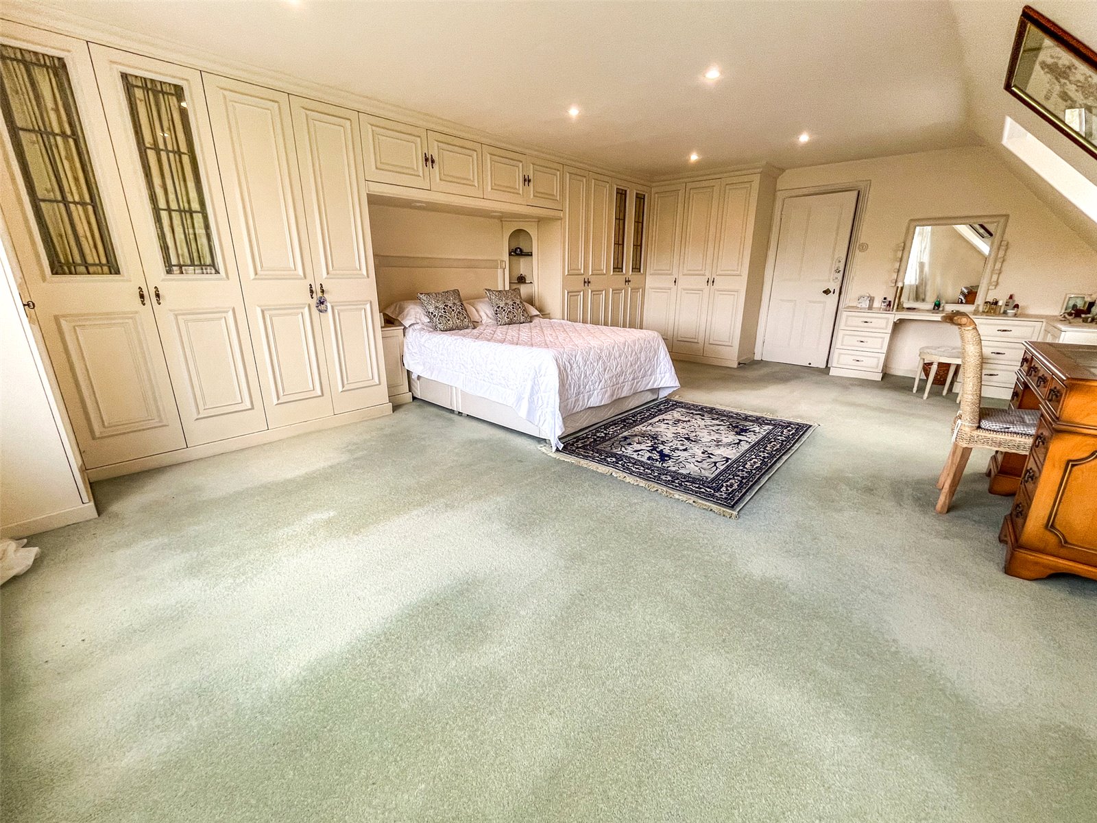 BEDROOM FOUR: A double sized room with a range of bespoke fitted wardrobe cupboards, radiator, down lighting, vanity area, eves storage, window with aspect over the rear gardens and grounds as well as views beyond of the grass paddocks.