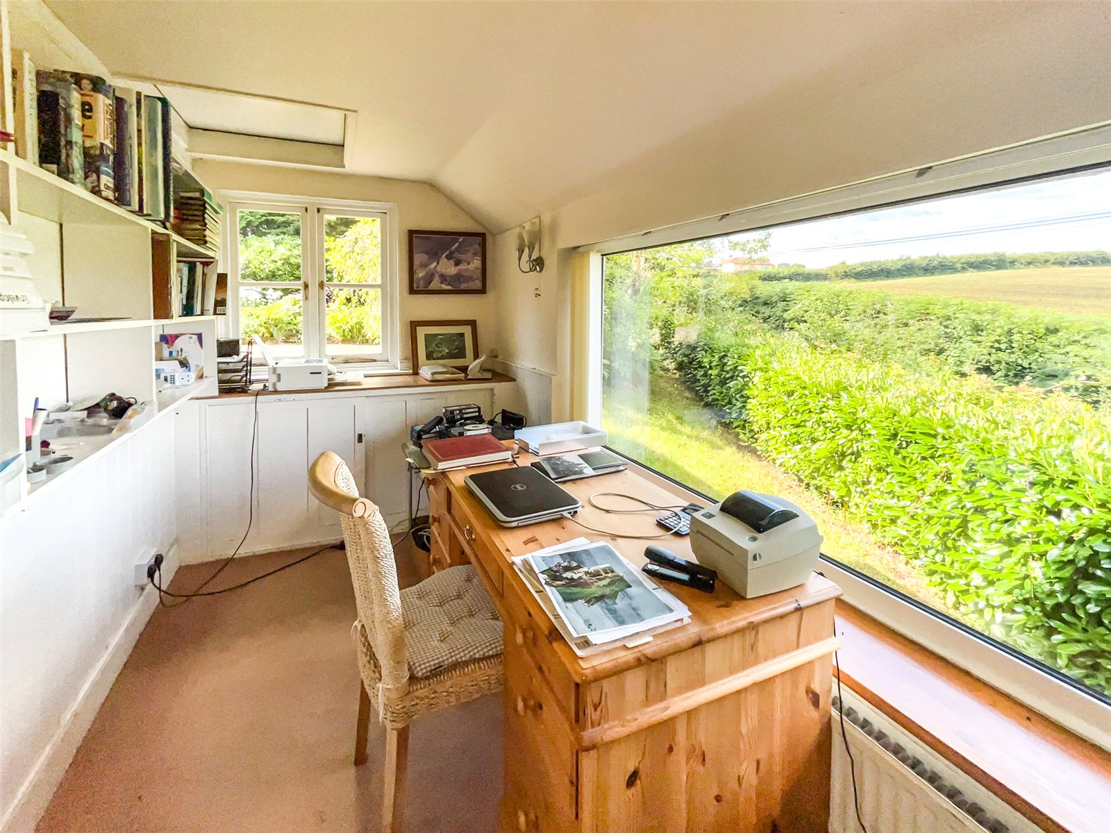 STUDY: A triple aspect room with stunning panoramic views of the countryside beyond, extensive range of fitted office storage cupboards and shelving, radiator, further windows with aspect over the gardens, door also leading out of the office to the garden.
