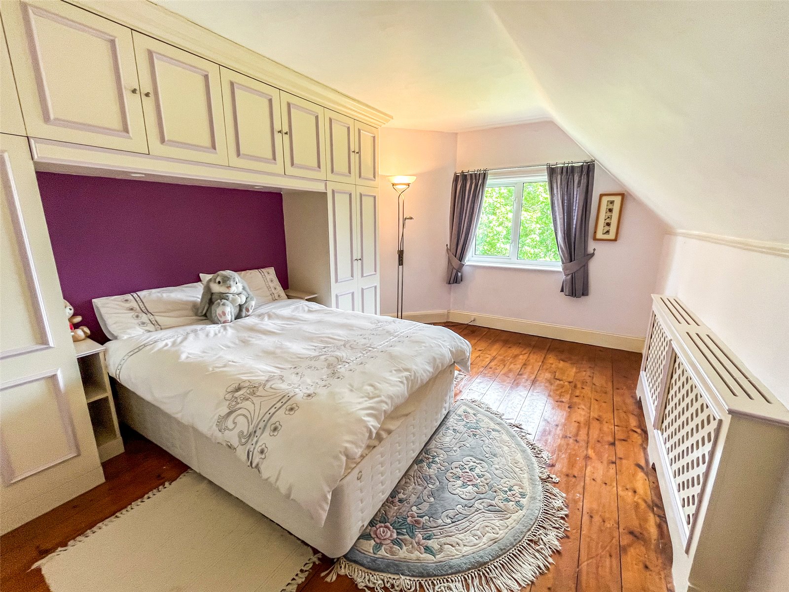 BEDROOM THREE: A double sized room with attractive exposed wooden floors, radiator and a range of bespoke fitted wardrobe cupboards and a window which enjoys fabulous far reaching views of the property’s own land.