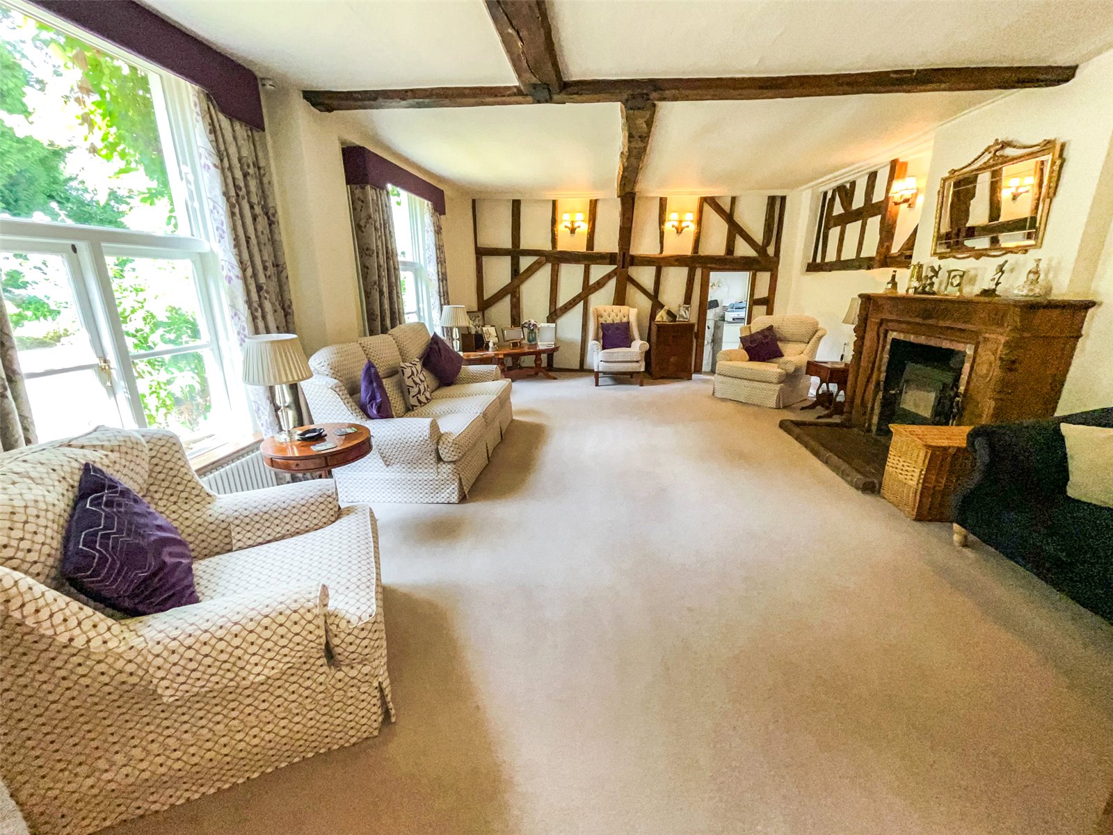 SITTING ROOM: A naturally bright and generous sized reception room, with a handsome feature fireplace, with a fitted wood burner, brick hearth, and a fabulous ornately carved wooden surround and mantle, attractive exposed beams to both the walls and the high ceilings, fitted storage cupboards, twin large windows overlooking the front gardens, doorway leading off to the downstairs study room.