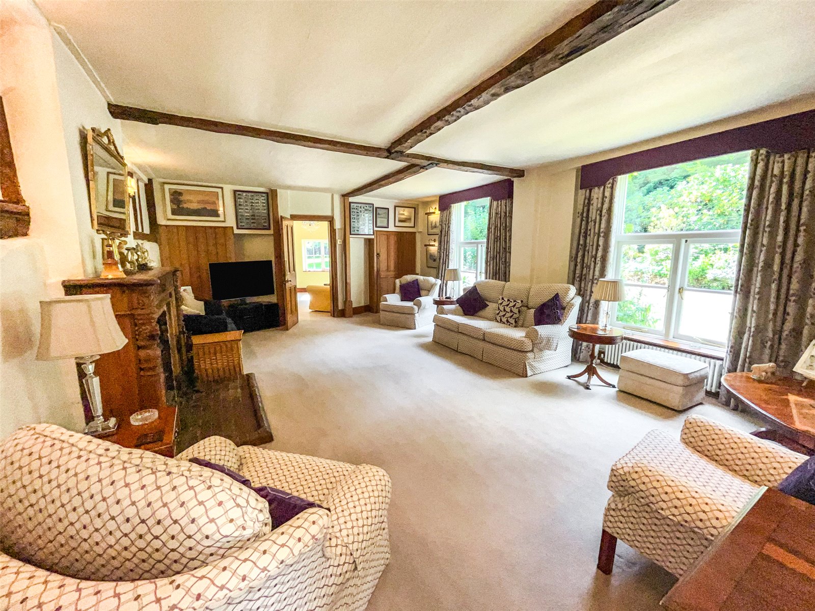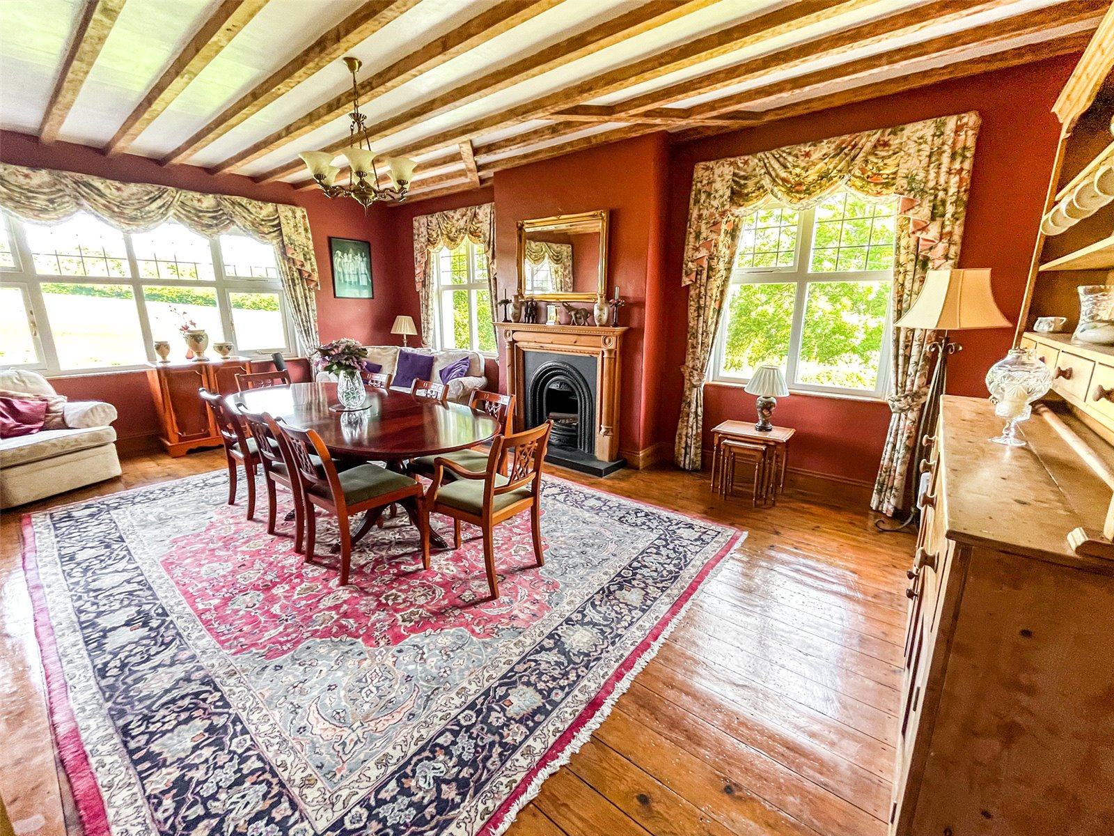 FORMAL DINING ROOM: A double aspect room with attractive polished wooden character flooring, an imposing feature character fireplace, with a cast iron front, with a carved wooden surround and mantle, high level beamed ceiling, wall lights, feature ceiling light, vintage style radiator, large character windows with breath-taking far-reaching views of the property’s own substantial grounds and also beyond of the further surrounding countryside.
