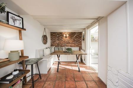 Dining area: Tiled floor. Feature exposed brick wall. Inset spotlights. Radiator.