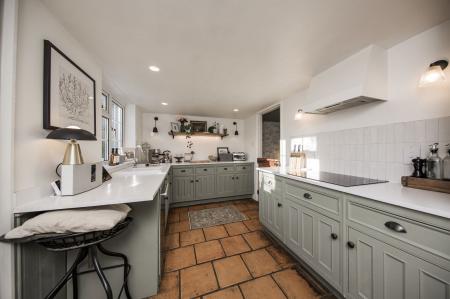 KITCHEN/DINER: Kitchen area: Double glazed window. Quartz effect worktop with inset electric hob and filter hood above. Inset ceramic sink. Built-in double oven. Space for dishwasher. Tiled floor. Inset spotlights.