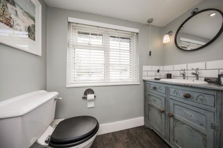 FAMILY BATHROOM: Double glazed window overlooking the rear garden. Panel enclosed bath with chrome mixer taps and hand-held shower attachment. WC. Pedestal wash basin. Tiled floor. Large walk-in shower cubicle with thermostatic shower featuring a drencher head and hand-held shower. Inset spotlights. Extractor fan.