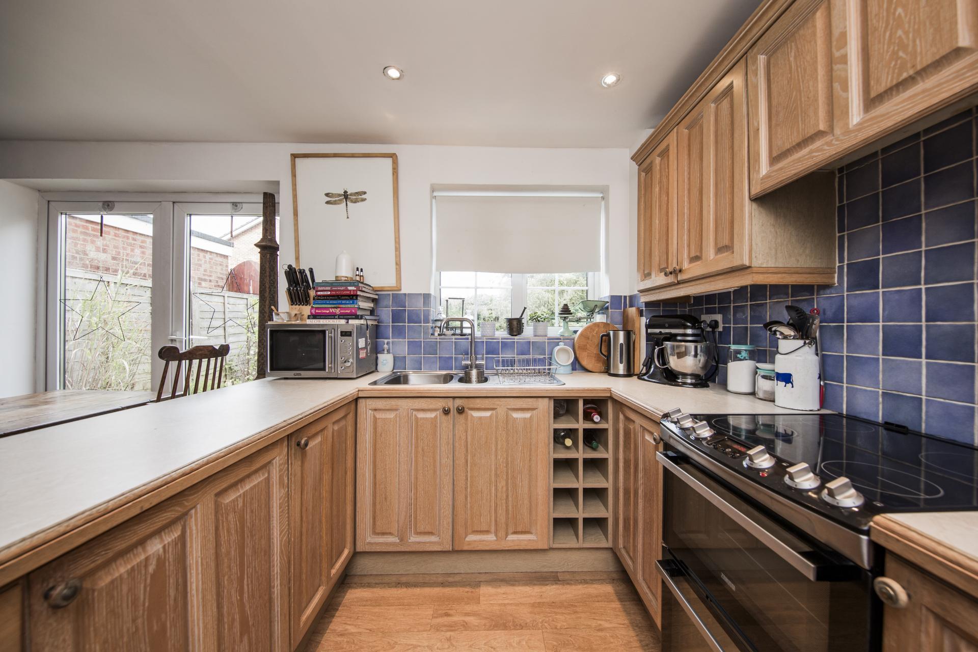 KITCHEN/DINER: Double glazed window overlooking the garden and double glazed French doors onto patio. Range of wood fronted matching wall and base units and laminate worktops with inset one and a half bowl stainless steel sink. Space for cooker. Integrated fridge. Part tiled walls. Inset spotlights.