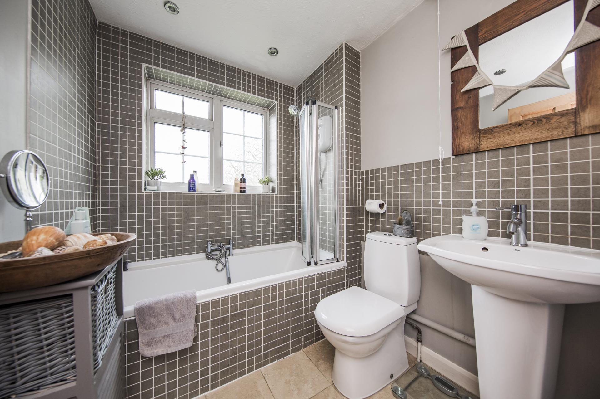 BATHROOM: Double glazed window. Pedestal wash basin. WC. Tile enclosed bath with mixer tap and shower attachment plus electric shower over and folding shower screen. Part tiled walls. Tiled floor. Chrome heated towel rail. Inset spotlights. Extractor fan.