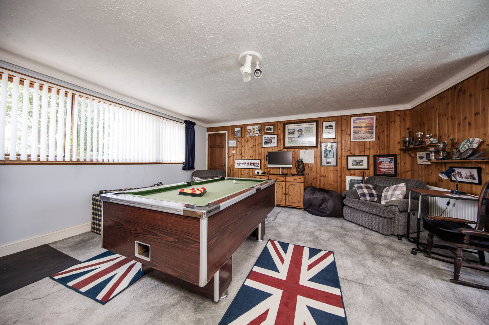 OUTSIDE: To the FRONT of the property is a DRIVEWAY providing off road parking for several vehicles and giving access to a GARAGE with window and personal door to outside, electric up-and-over door, wall mounted fuse box, power and light. Raised brick flower and shrub borders and gated access either side give access to the rear. A large flagstone patio terrace to the front provides a further seating area. The REAR GARDEN enjoys areas of lawn, flower and shrub borders and being fence enclosed with ornamental fish pond with running water feature and various pathways giving access to a large HEATED SWIMMING POOL with a terraced surround. Decked area (in need of attention) with summer house and a pool house with leisure facilities (unused for some time). Outside lighting and side area with greenhouse, garden shed and pool room housing air source heater and filtration system. Outside tap.