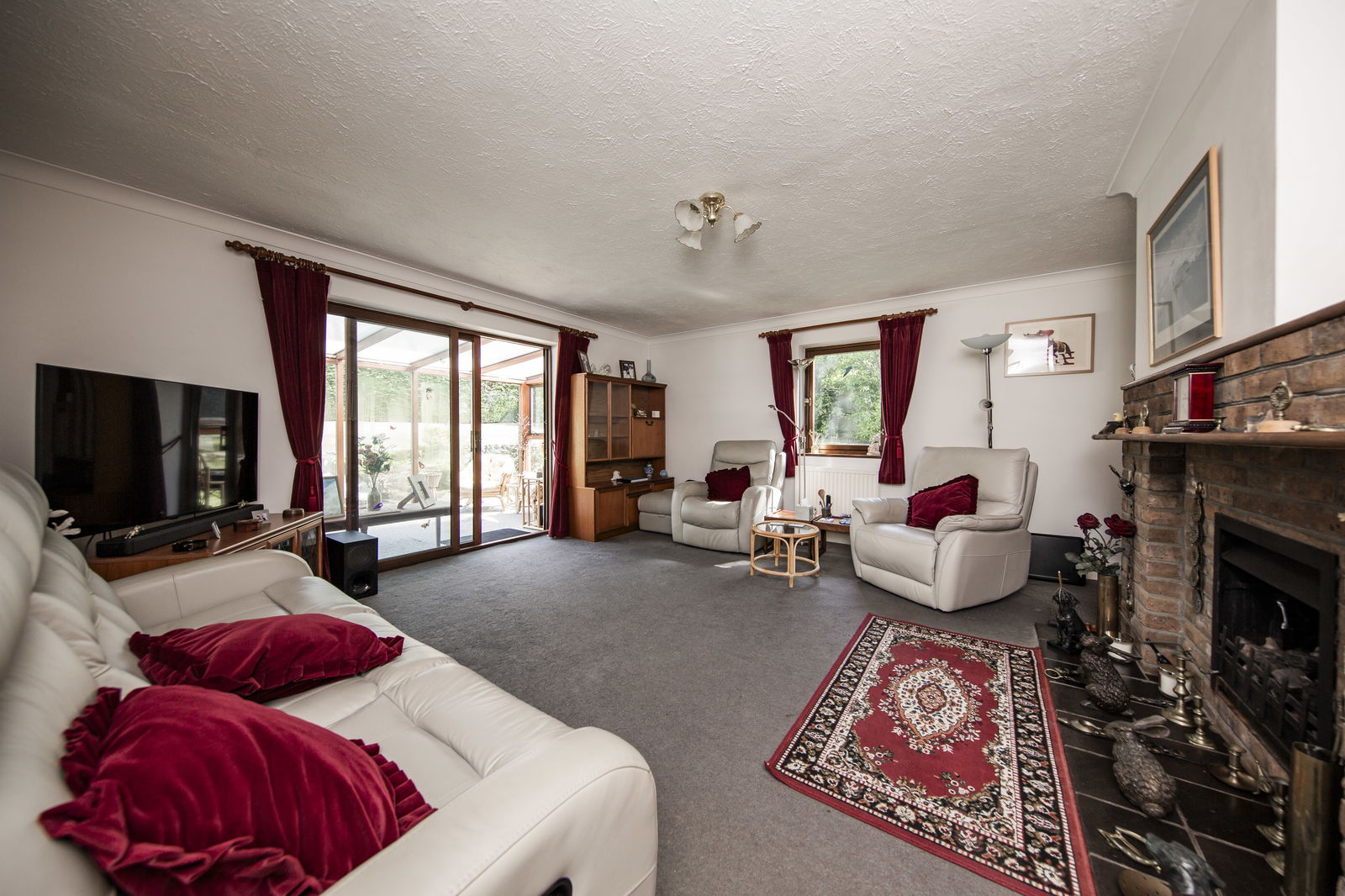SITTING ROOM: Triple aspect room with double glazed windows to sides and sliding double glazed patio doors to conservatory. Attractive brick built fireplace with inset gas fire, timber mantle and display shelf. Radiators.
