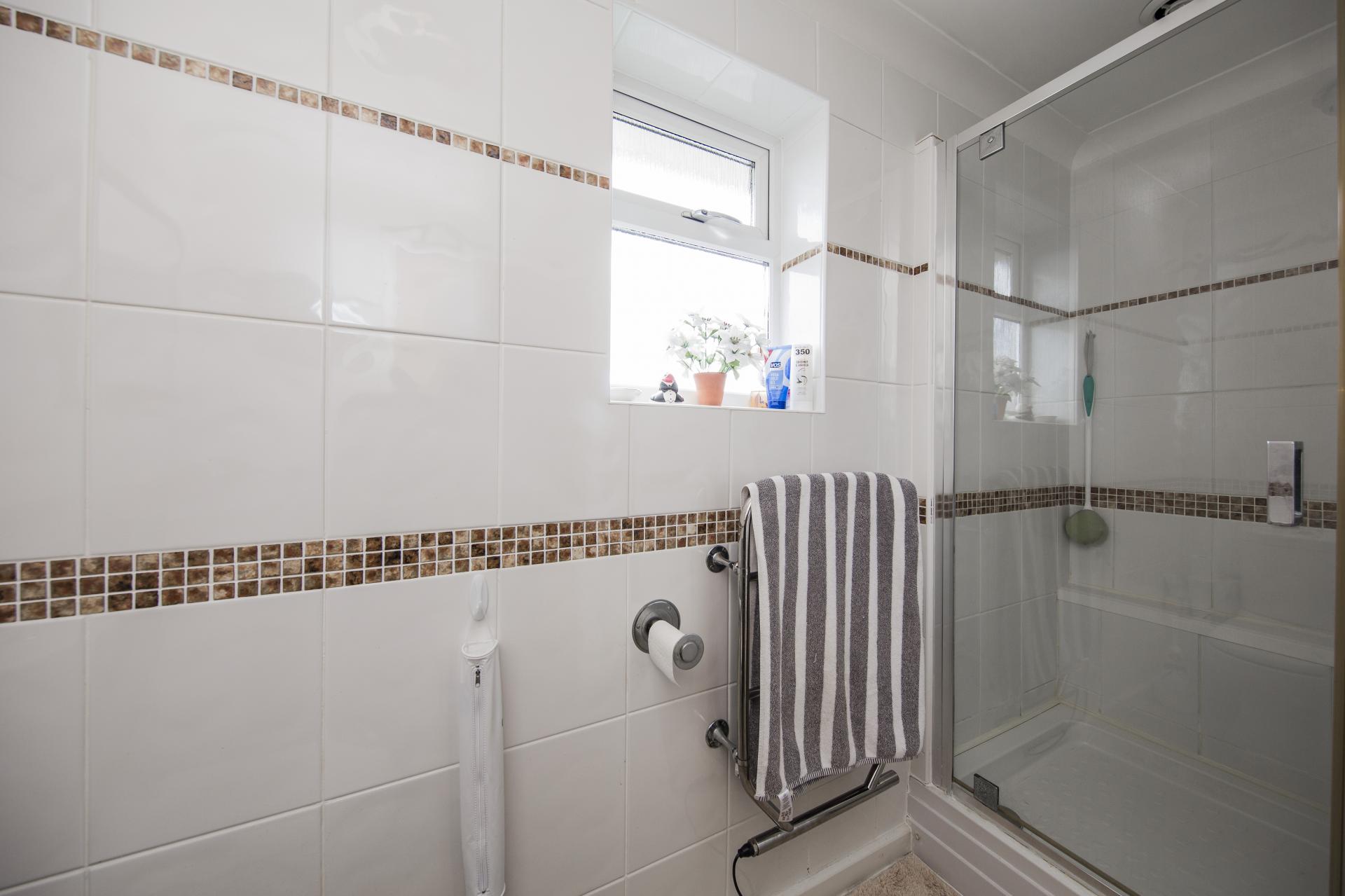 EN-SUITE SHOWER ROOM: Fitted with a white suite with chrome effect fitments of low level WC, pedestal wash basin, tile enclosed shower cubicle with 'Mira' unit within. Heated towel rail. Fully tiled to walls and tiled flooring, shavers point, wall mounted electric heater. uPVC obscure double glazed window to side.