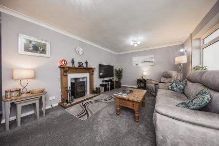 LIVING ROOM: Large uPVC double glazed window with door aside into conservatory. Attractive fireplace with timber surround incorporating fitted wood burning stove upon tiled hearth. Radiator.