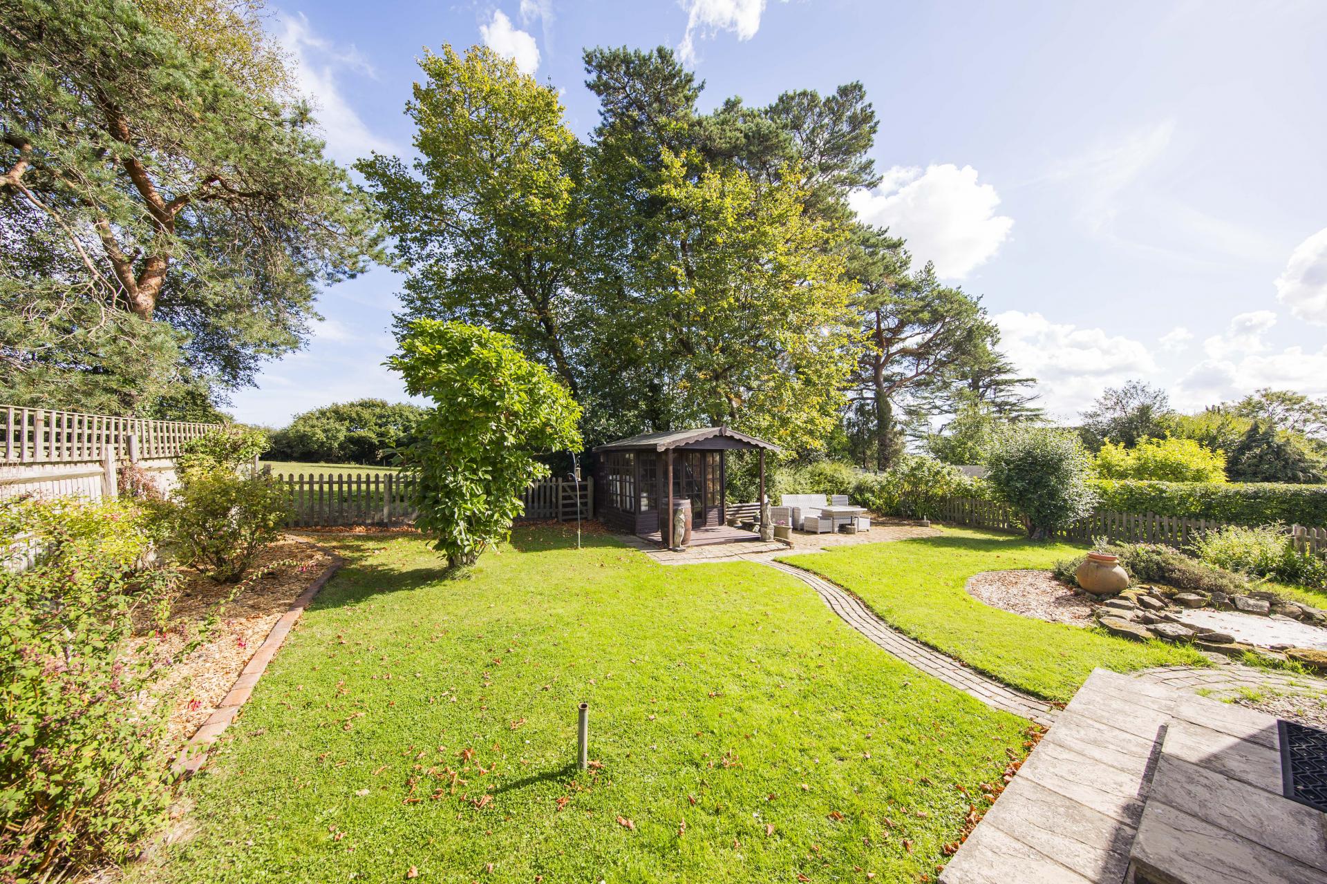 OUTSIDE: To the front of the property is a large and recently laid tarmacadam driveway providing off road parking for a number of vehicles and giving access to a single garage with up and over door, presently used as a well laid out utility area with sink with double drainer and storage below and space and plumbing for several appliances with power and light enclosed, wall mounted electric fuse box and rear door to garden. Area of lawn and fence with gate giving access to a useful side area with timber raised vegetable bed, aluminium glazed greenhouse upon a brick base. Outside tap with pathway beyond a useful large garden shed and further raised vegetable beds enclosed by picket fencing with wrought iron gate leading into the rear garden itself. Enjoying a private aspect with areas of lawn, brick paved patio and pathways. Ornamental fishpond, established flowers and shrubs backing onto fields. Large timber Summerhouse with covered veranda. Covered log store & access to oil tank.