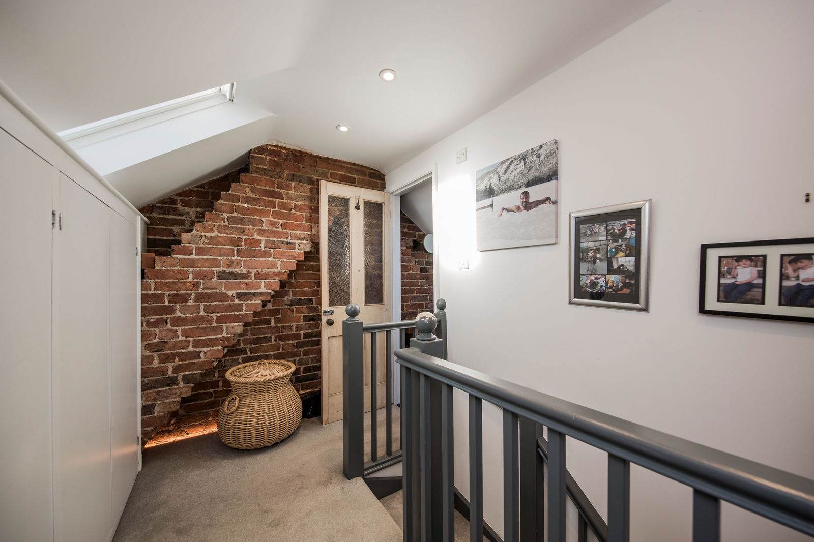 Velux double glazed roof window. Feature exposed brick wall. Range of built in cupboards. Inset spotlights.
