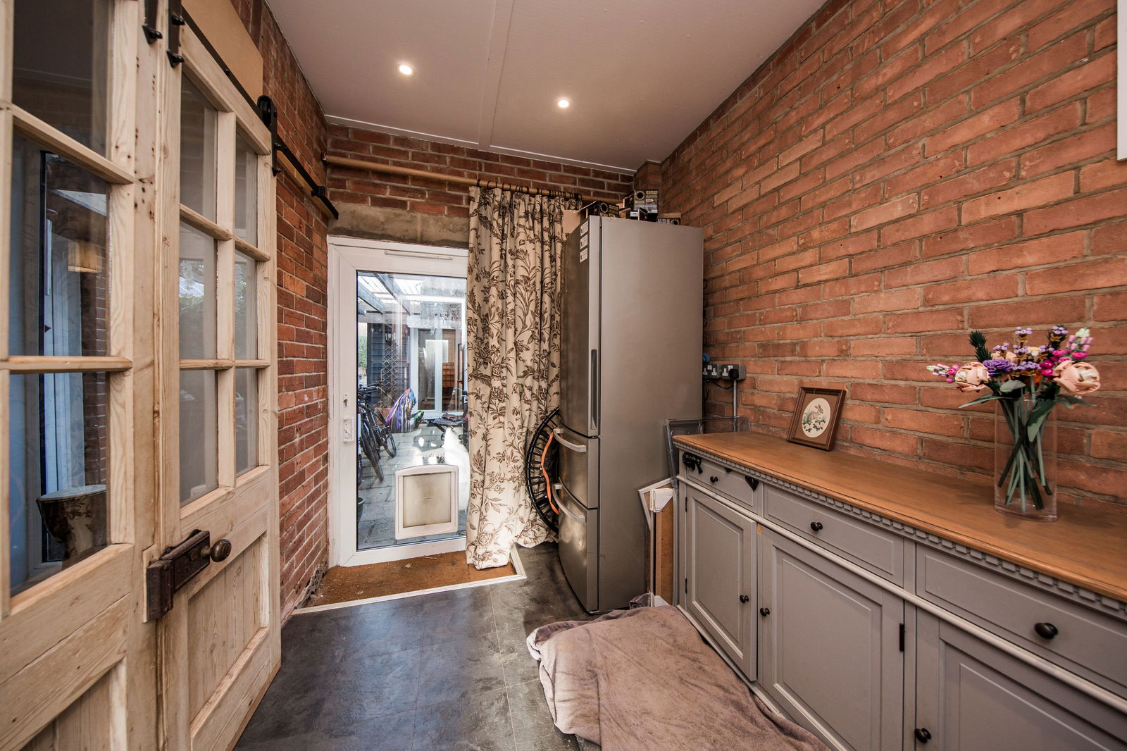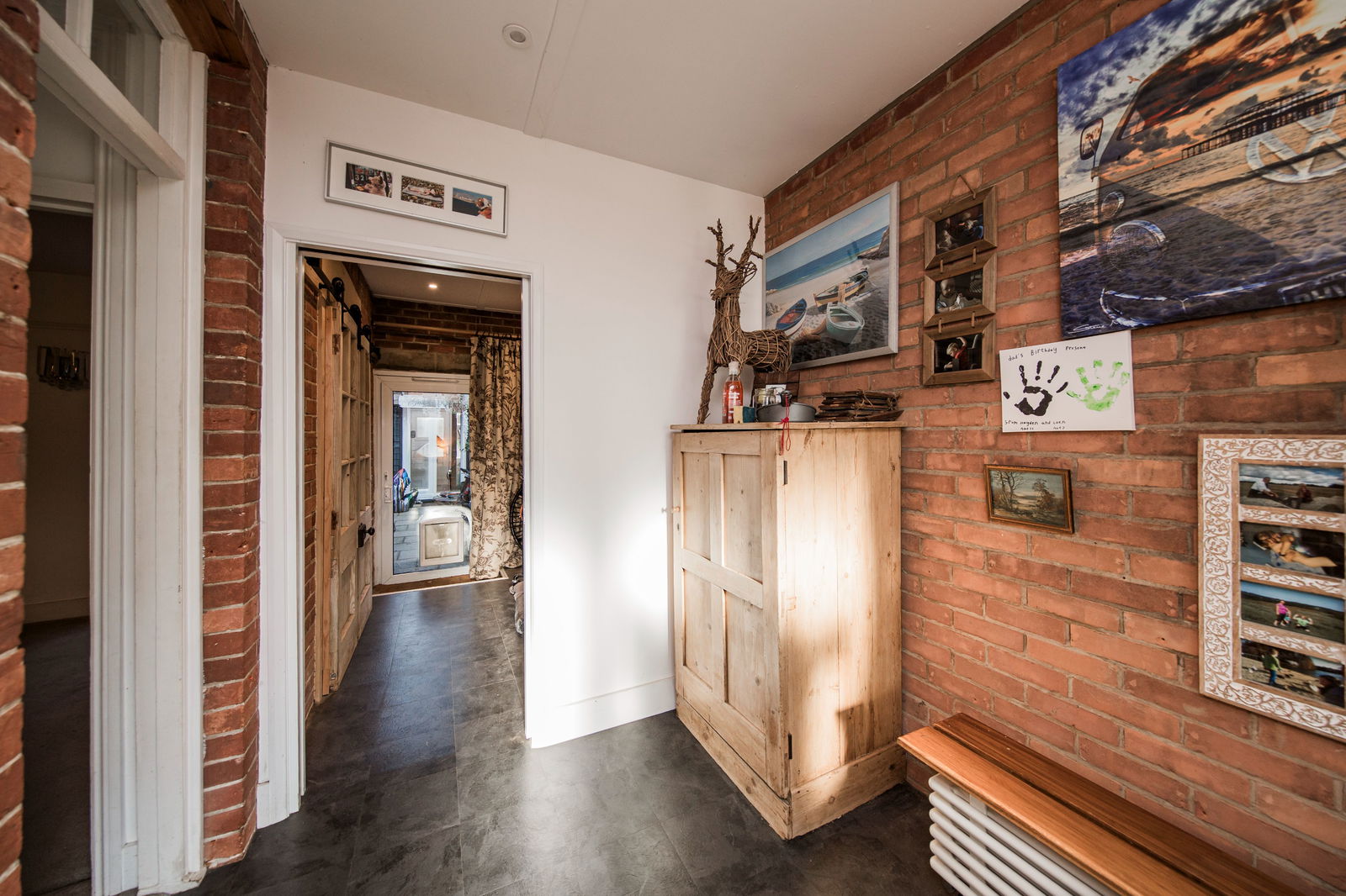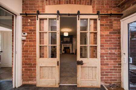 Sliding double glazed front door. Feature exposed brick wall.