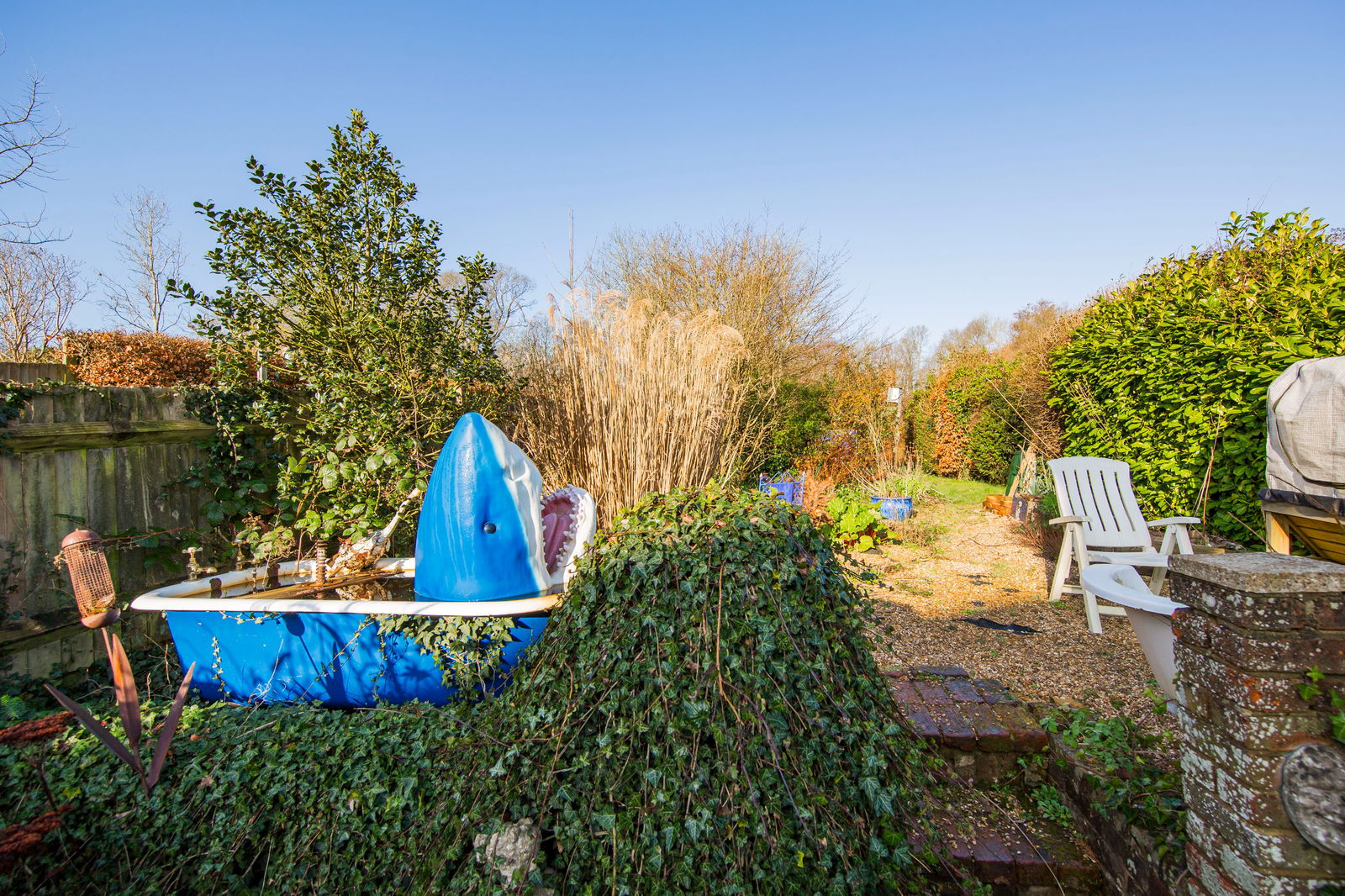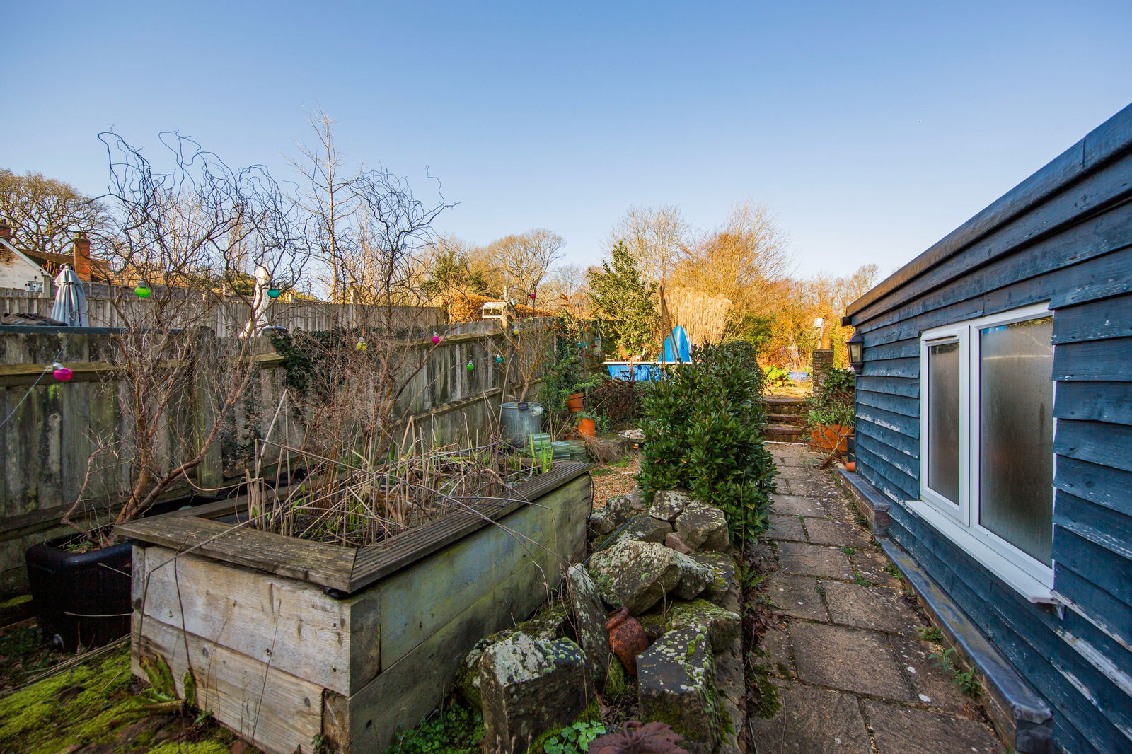The property is approached via its own shingle driveway providing off street parking for a number of vehicles. The rear garden features a covered pergola over paved patio area, raised pond, multiple interesting areas of the garden with shingled areas, lawn with mature hedging and shrub borders and fruit trees. There is an outside toilet with hot and cold running water, a timber summer house and 2 timber sheds plus a covered storage area.