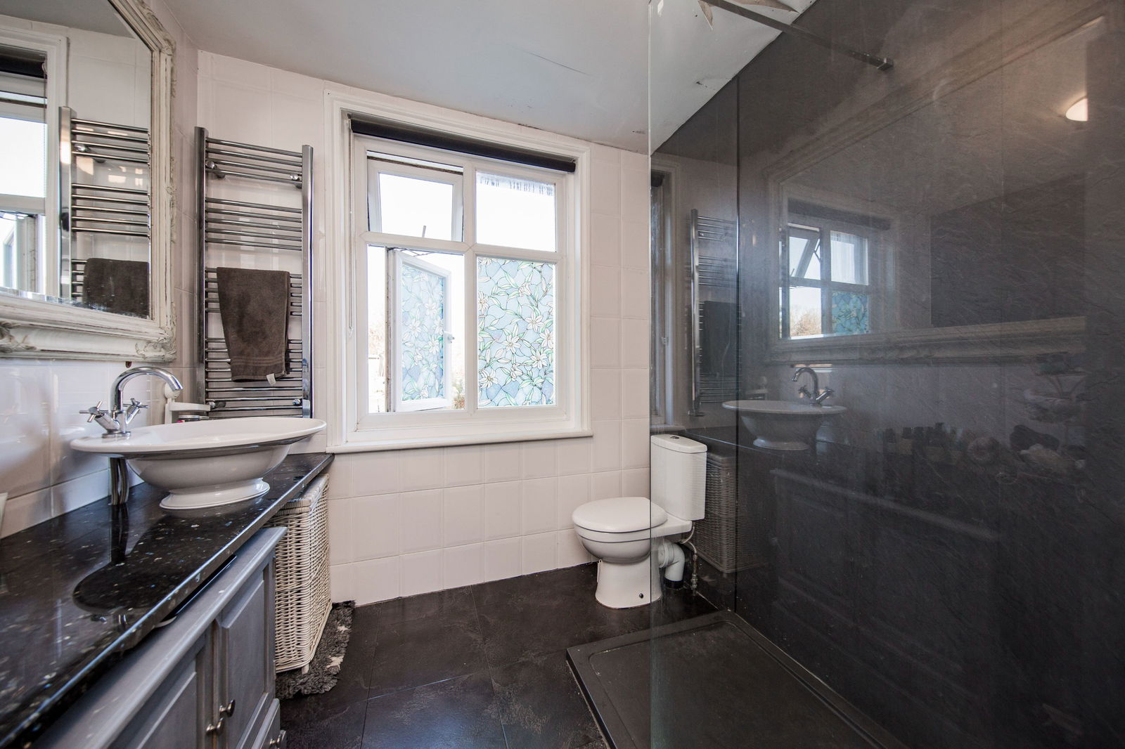 Double glazed window. Large walk in shower with thermostatic aqualisa shower featuring a handheld shower plus drencher head. Granite worktop with wash basin. WC. Chrome heated towel rail. Tiled floor and part tiled walls. Extractor fan.