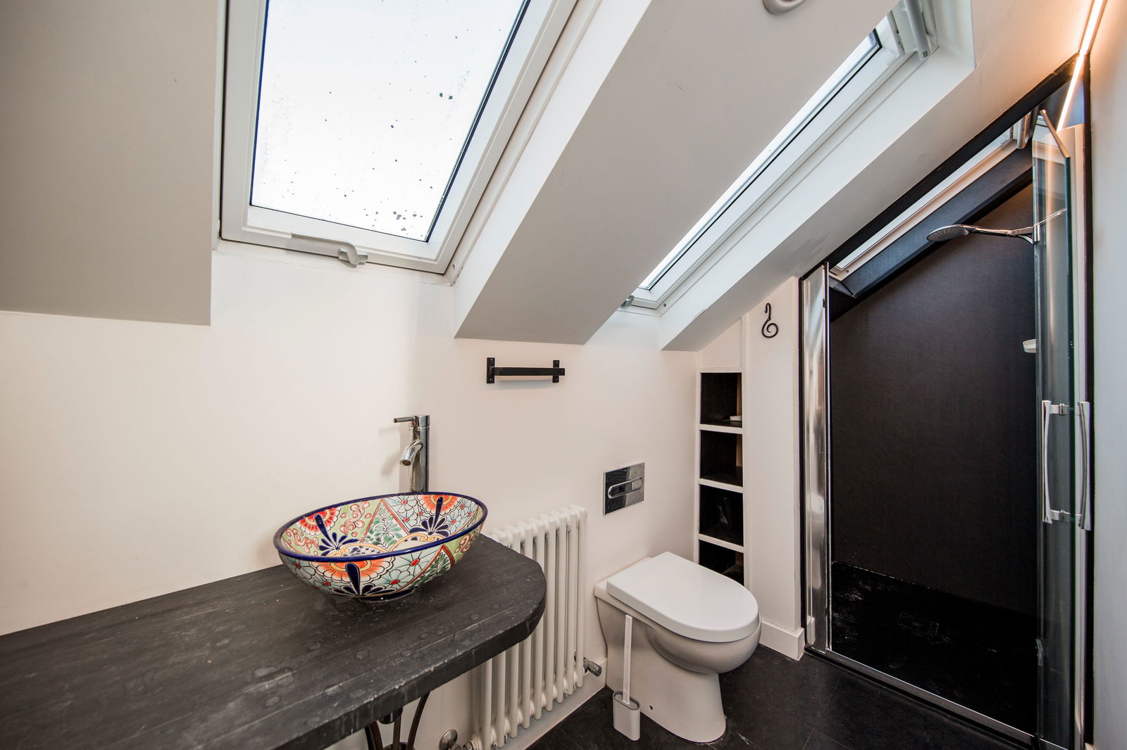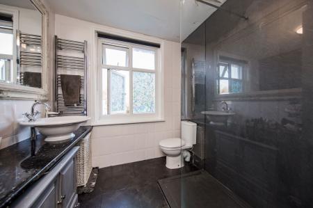3 Velux double glazed roof windows. Shower cubicle with Mira thermostatic shower with both internal and external operating switch. WC with concealed cistern. Slate worktop with feature wash basin. Built in storage. Exposed brick wall. Extractor fan. Victorian style radiator.